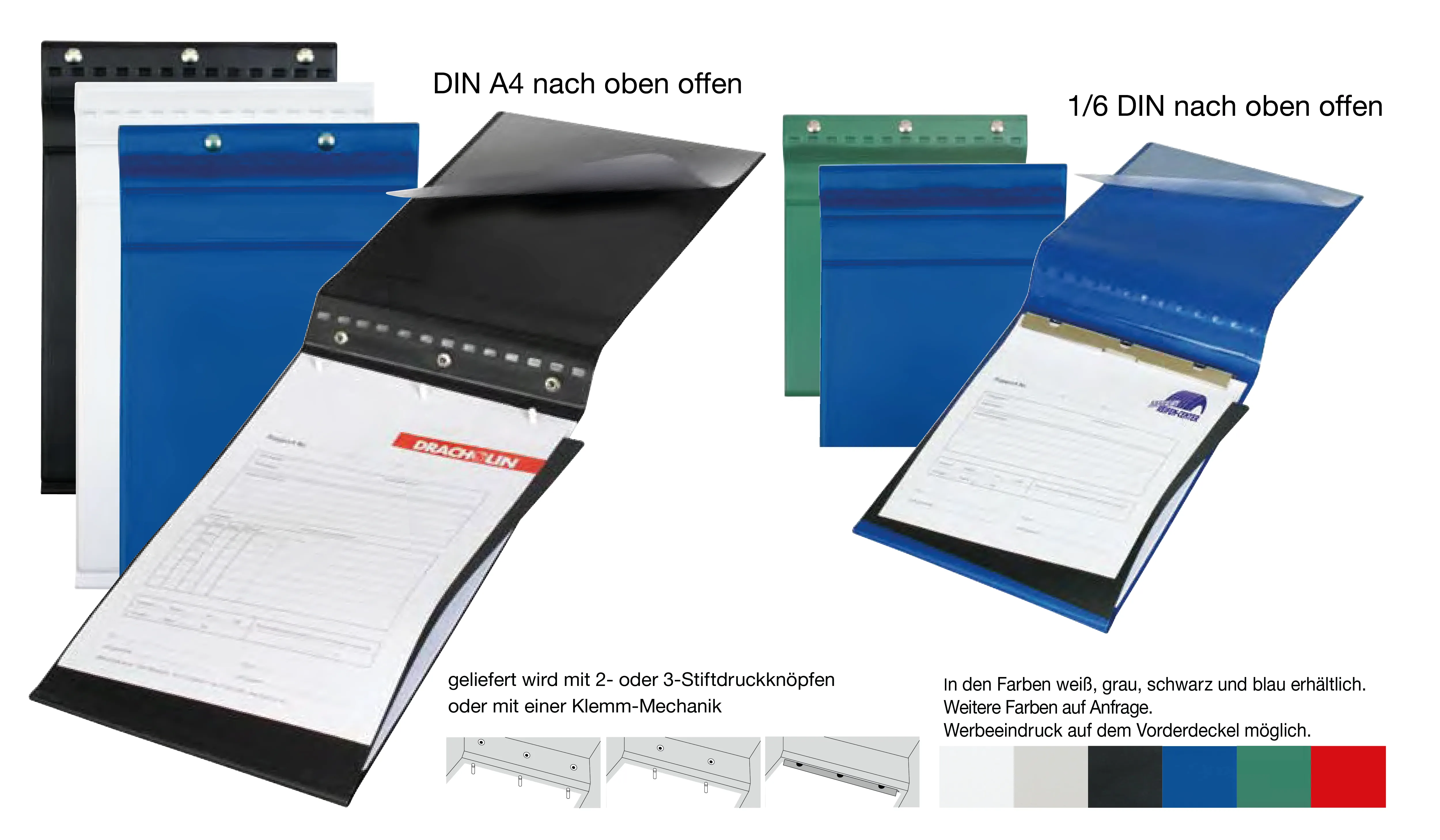 | Art.Nr.: | MH455 | Lieferzeit: | 2-3 weeks | Gewicht: | 0,400 kg | Format: | DIN A4 Einlageformat max. 20 x 330 mm · 1/6 Din Einlageformat max. 210 x 230 mm | Farben: | weiß · grau · schwarz · blau · ab 50 Stück in verschiedenen Farben auf Anfrage möglich | Ausstattung: | 2 oder 3-Stiftdruckknöpfe oder Klemm-Mechanik, Schreibschutz und transparente Lasche innen | Material: | Weichfolie, Güteklasse I | Druck: | Siebdruck (ab 50 Stück auf Anfrage) | Herkunftsland: | ![]() |