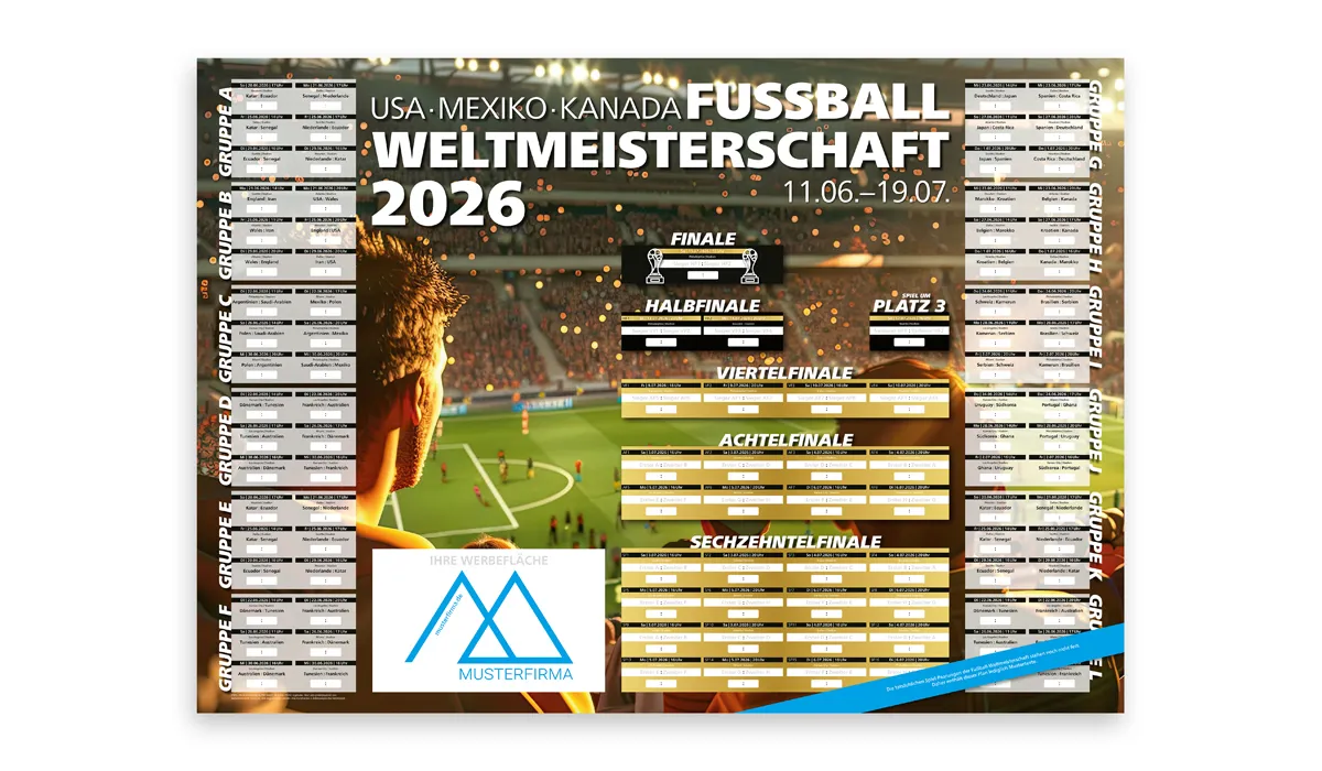 | Art.Nr.: | GE99902 | Lieferzeit: | 2-3 Wochen | Gewicht: | 0,085 kg | Format: | 841 x 594 mm (A1) | Ausstattung: | Hintergrund: Stadionemotion | Material: | mattes Bilderdruckpapier | Option(en): | gefalzt auf A4 | Verpackungseinheit: | 175 | Werbefläche: | siehe Standbogen | Druck: | 4C-Quality inklusive | Druckfarben: | CMYK | Mindestmenge: | 100 | Herkunftsland: | ![]() |