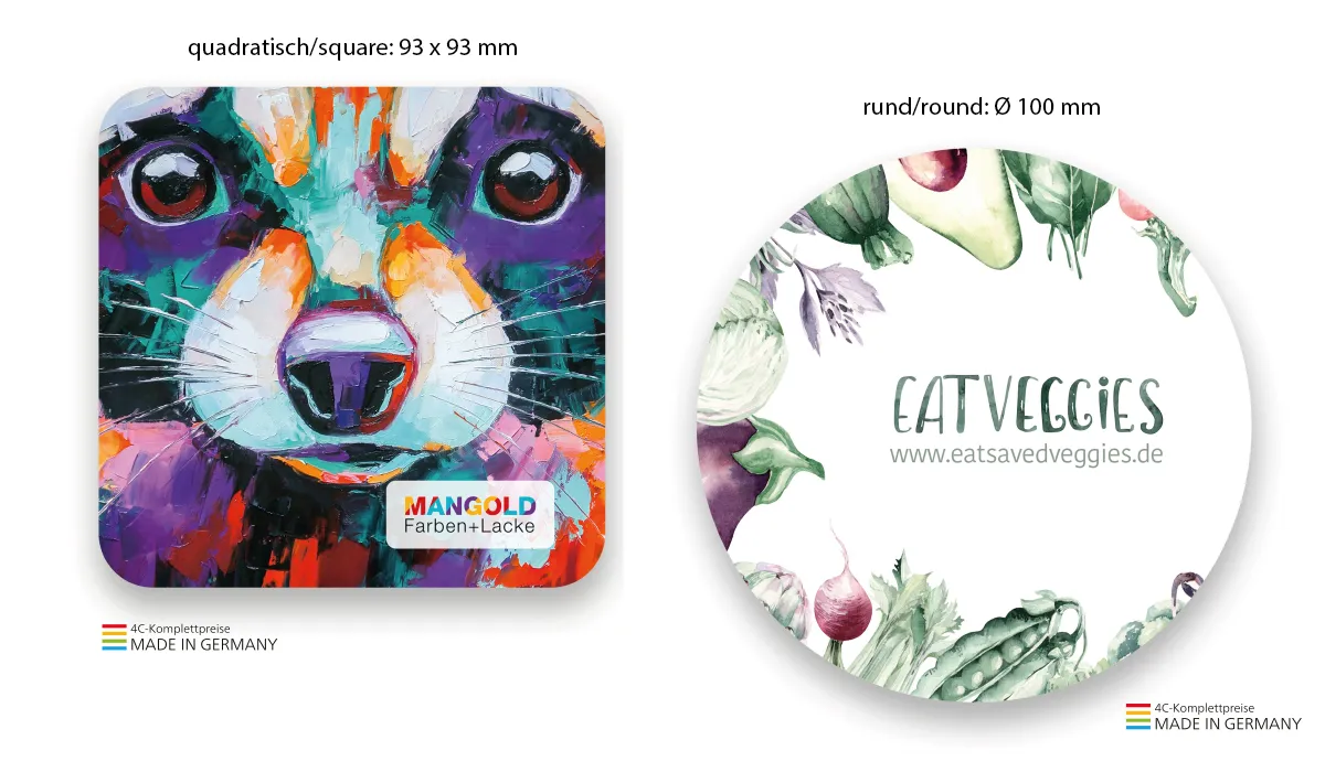 | Art.Nr.: | GE60038 | Lieferzeit: | 2-3 weeks | Gewicht: | 0,006 kg | Format: | rund: Ø 100 mm · quadratisch: 93 x 93 mm | Verarbeitung: | gestanzt und zu 100 Stück eingeschweißt | Material: | Holzschliffpappe 1,4 mm | Verpackungseinheit: | 2000 | Werbefläche: | siehe Standbogen | Druck: | 4C-Quality beidseitig inklusive | Druckfarben: | CMYK | Mindestmenge: | 250 | Herkunftsland: | ![]() |
