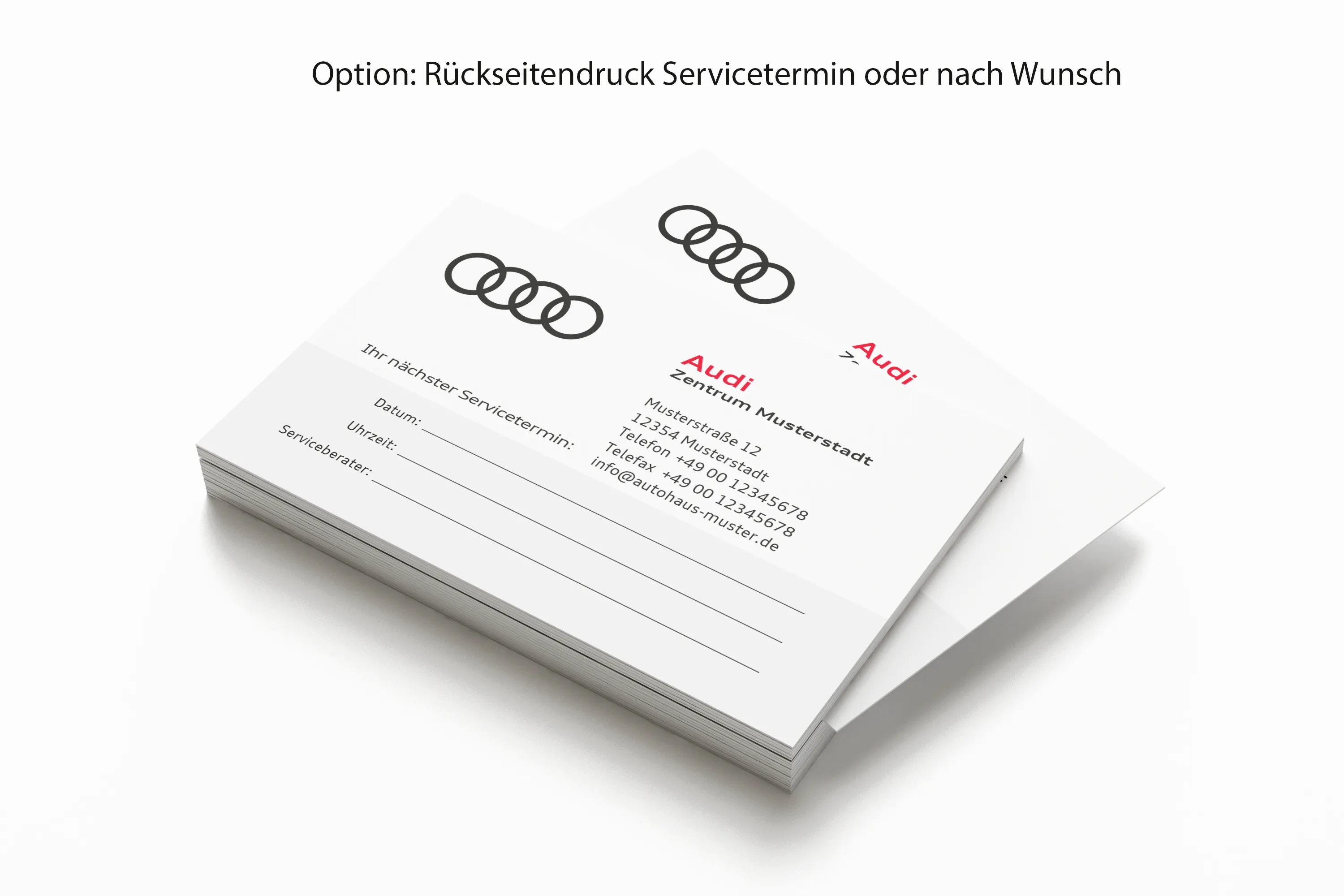 | Art.Nr.: | AUDI Zentrum Terminkarten | Lieferzeit: | 3-4 days | · Lieferung Ihrer Druckdaten als Antwort auf die Bestellbestätigungsmail · Layout- und Gestaltungsarbeiten nach Ihren Vorgaben · Korrekturabzüge vor Druckbeginn (außer im Basischeck) | Hersteller: | deprismedia.com [Susann & Lars Ströse GbR] Bahnhofstraße 32 DE-07422 Bad Blankenburg info@deprismedia.com www.deprismedia.com Tel. +49 3 67 41-1 88 36-0 |