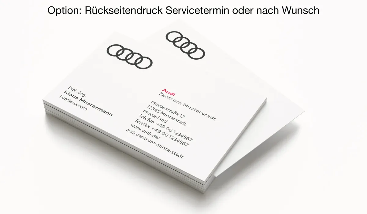 | Art.Nr.: | DM40122 | Lieferzeit: | 3-4 Werktage | Gewicht: | 0,100 kg | Format: | 85 x 54 mm | Ausstattung: | Die Visitenkarten erstellen wir immer nach den aktuellen Corporate-Identity Richtlinen bzw. Gestaltungsrichtlinien der Audi AG nach ISO Norm bzw. 100% Audit. Alternativ stellen wir Ihnen auch Visitenkarten nach Ihren Wünschen her. | Material: | 250 g/m² Profisilk | Druck: | Digitaldruck | Druckfarben: | CMYK (4/0-farbig einseitig oder 4/4-farbig beidseitig) | · Lieferung Ihrer Druckdaten als Antwort auf die Bestellbestätigungsmail · Layout- und Gestaltungsarbeiten nach Ihren Vorgaben · Korrekturabzüge vor Druckbeginn (außer im Basischeck) | Hersteller: | deprismedia.com [Susann & Lars Ströse GbR] Bahnhofstraße 32 DE-07422 Bad Blankenburg info@deprismedia.com www.deprismedia.com Tel. +49 3 67 41-1 88 36-0 |