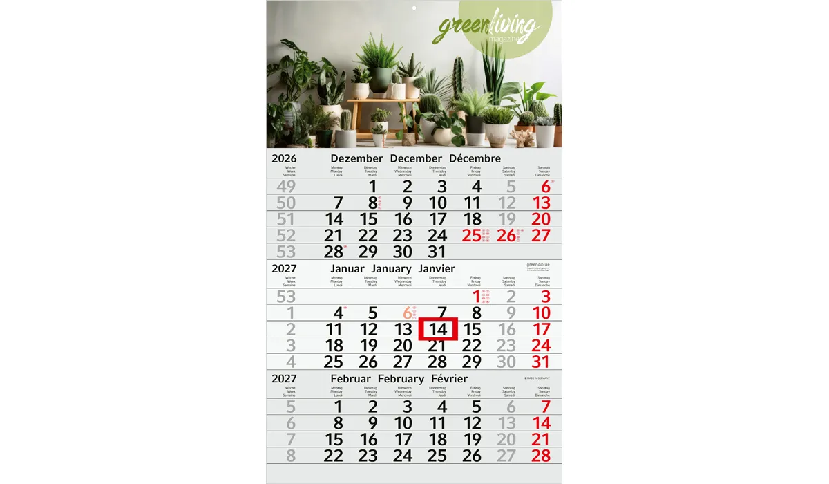 | Order no later than 06/19/2026 (proof confirmation must be submitted by 06/25/2026). Delivery on your desired date, if you specify it in your order, but not later than 09/01/2026. Orders without preferred date we do not deliver directly after completion, but before 07/01/2026. | product-no.: | GE140015 | delivery time: | 2-3 Wochen | weight: | 0,155 kg | format: | 300 x 490 mm total · 300 x 350 mm calendar | calendar: | 3 languages ​​D/GB/F light gray/red | Advertising: |