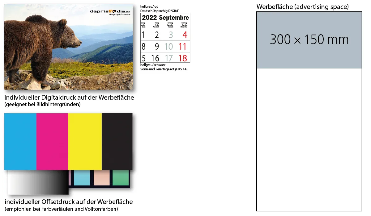For calendars (with the exception of picture calendars), deprismedia.com sends samples from past productions. For this reason, calendars from the current or past years are made available to you. However, the versions and variants are always the same as the range for the coming year and are only used to order a main quantity. Alternative patterns are sometimes used for notebooks (in some cases a sample card is also supplied). These articles do not exactly match the notebook you ordered, but they do offer an equivalent product example. |