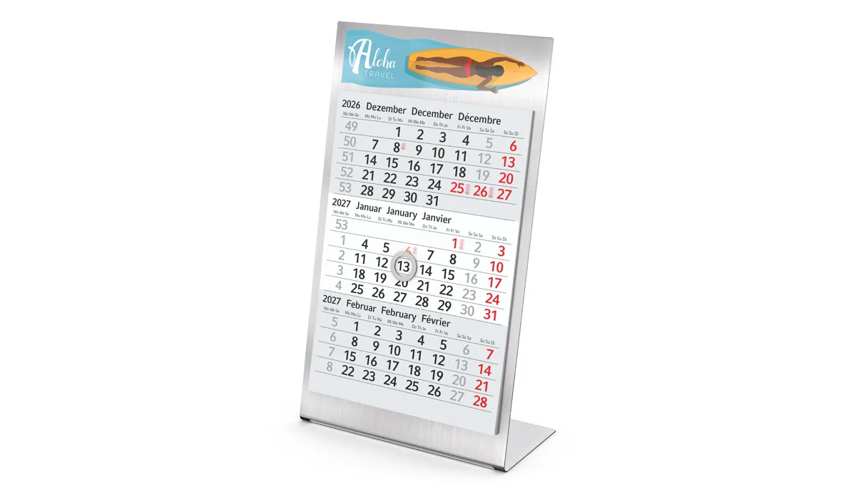 | Order no later than 06/19/2026 (proof confirmation must be submitted by 06/25/2026). Delivery on your desired date, if you specify it in your order, but not later than 09/01/2026. Orders without preferred date we do not deliver directly after completion, but before 07/01/2026. | product-no.: | GE420003 | delivery time: | 2-3 weeks | weight: | 0,160 kg | format: | 105 x 230 mm total (incl. 50 mm stand-feet) · 95 x 135 mm calendar | calendar: | 3 languages ​​D/GB/F light gray · calendar 2027 | finishing: | calendar block with head gluing · adheres magnetically to the stainless-steel stands | equipment: | stand in brushed stainless steel (plano supplied) · ring magnet as the date slider | individual packaging: | placed individually in full papp shipping case white 245 x 120 mm (inclusive) | packaging units: | 50 | advertising area: | front: 95 x 25 mm (head) | print: | screen printing digital (including) | printing ink: | cmyk | min. quantity: | 25 | country of origin: | ![]() |