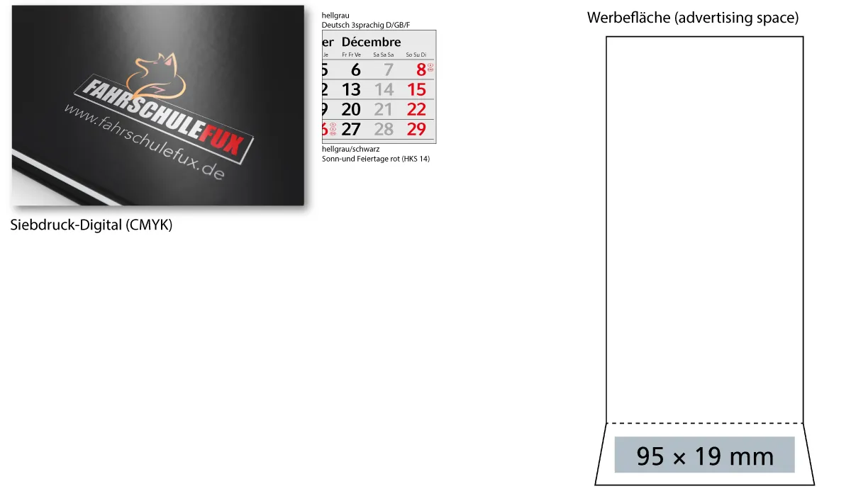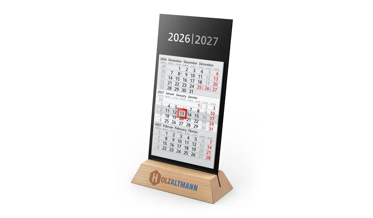 | Order no later than 06/19/2026 (proof confirmation must be submitted by 06/25/2026). Delivery on your desired date, if you specify it in your order, but not later than 09/01/2026. Orders without preferred date we do not deliver directly after completion, but before 07/01/2026. | product-no.: | GE550002 | delivery time: | 2-5 Wochen | weight: | 0,155 kg | format: | 125 x 215 mm total (incl. 26 mm stand-feet) · 95 x 135 mm calendar | calendar: | german 3 language D/GB/F light gray · 2 years: calendarium 2027/2028 including cover sheet | finishing: | calendar block with head glue on black cardboard back wall | equipment: | wooden display with cardboard back wall, calendar and date slide · cardboard back wall including the number of years in silver | material: | wooden display, cardboard back wall and calendar from FSC material | individual packaging: | including: individually placed in plastic bag | packaging units: | 20 | advertising area: | 95 x 25 mm (wooden display) | print: | screen printing digital included (wooden display) | printing ink: | screen printing digital: CMYK | min. quantity: | 25 | country of origin: | ![]() |