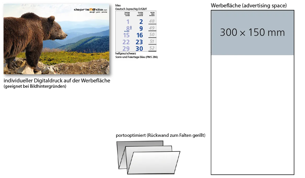 equipment: | perforated calendar pages · optimized for postage · back wall grooved for folding · red date slider (HKS 14) | individual packaging: | full papp shipping case brown: no. 03 - 350 x 250 mm · corrugated packaging white: no. 17 - 313 x 350 x 19 mm (B4-large letter format) · corrugated shipping case white: no. 43 - 350 x 250 mm (B4-large letter format) | packaging units: | 100 | advertising area: | 300 x 150 mm | print: | digital printing on top tab | printing ink: | cmyk | min. quantity: | 25 | country of origin: | ![]() |
