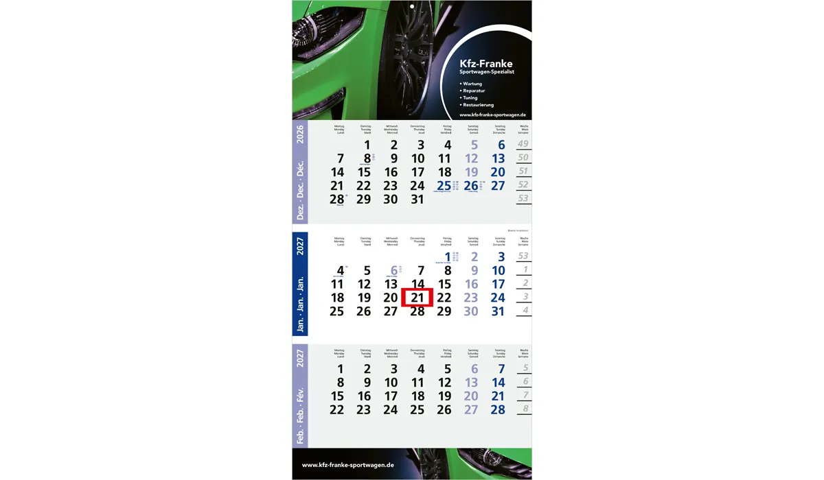 | Order no later than 06/19/2026 (proof confirmation must be submitted by 06/25/2026). Delivery on your desired date, if you specify it in your order, but not later than 09/01/2026. Orders without preferred date we do not deliver directly after completion, but before 07/01/2026. | product-no.: | GE280004 | delivery time: | 2-5 weeks | weight: | 0,170 kg | format: | 300 x 600 mm total · 300 x 420 mm calendar | calendar: | german 3 languages ​​D/GB/F blue or green | Advertising: |