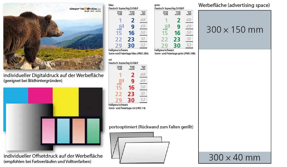 equipment: | perforated calendar pages · optimized for postage · back wall grooved for folding · red date slider (HKS 14) | option(s): | date slider in special colors (from 1.000 pieces) · eyelets | individual packaging: | full papp shipping case brown: no. 03 - 350 x 250 mm · corrugated packaging white: no. 17 - 313 x 350 x 19 mm (B4-large letter format) · corrugated shipping case white: no. 43 - 350 x 250 mm (B4-large letter format) | packaging units: | 100 | advertising area: | 300 x 150 mm (head) + 300 x 40 mm (feet) | print: | digital printing or offset printing on top tab and page footer | printing ink: | cmyk | min. quantity: | 250 | country of origin: | ![]() |