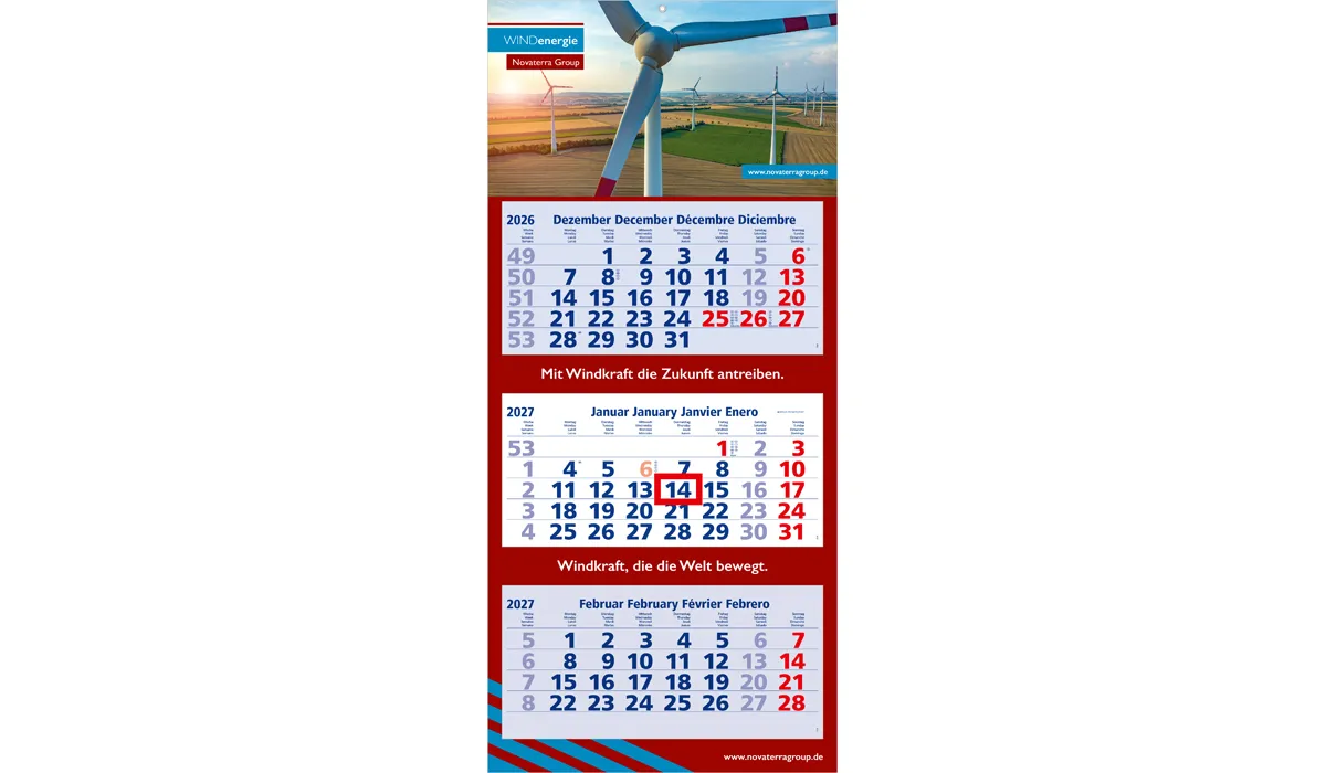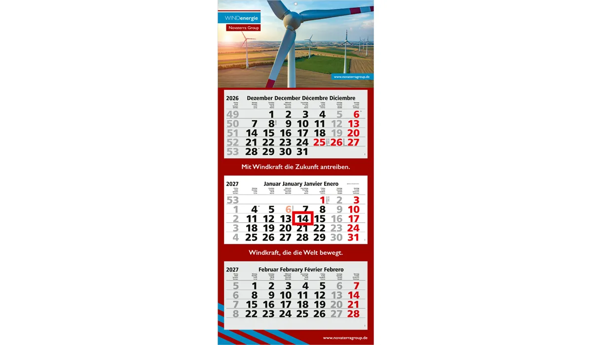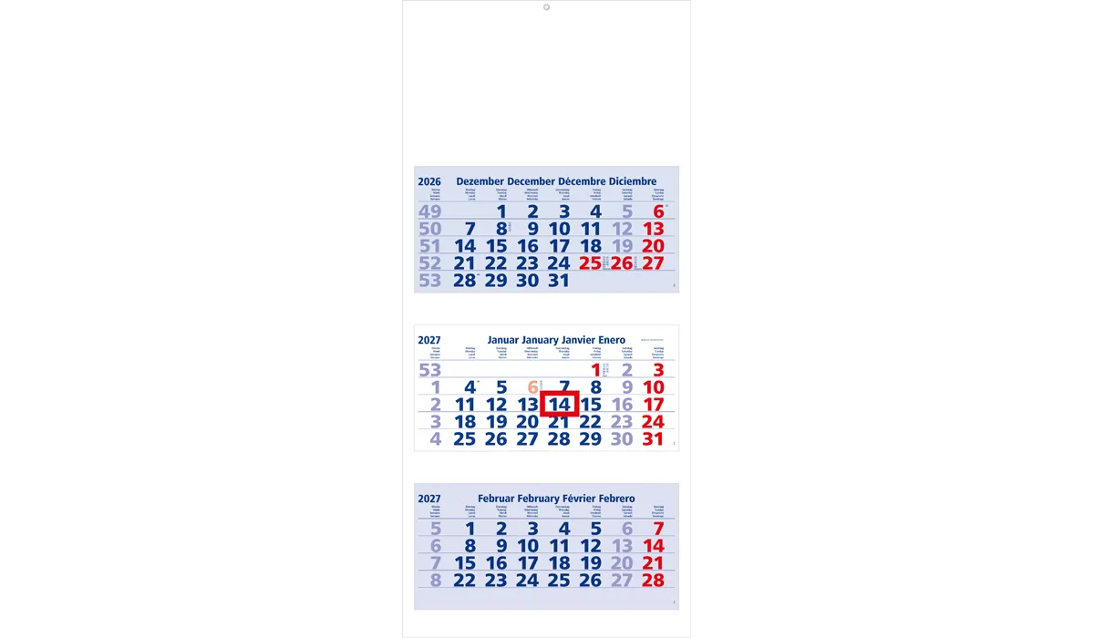 | Order no later than 06/19/2026 (proof confirmation must be submitted by 06/25/2026). Delivery on your desired date, if you specify it in your order, but not later than 09/01/2026. Orders without preferred date we do not deliver directly after completion, but before 07/01/2026. | product-no.: | GE720001 | delivery time: | 2-5 weeks | weight: | 0,270 kg | format: | 365 x 805 mm total · 335 x 160 mm per calendar block | calendar: | 4 languages D/GB/F/E light gray or light blue | Advertising: |