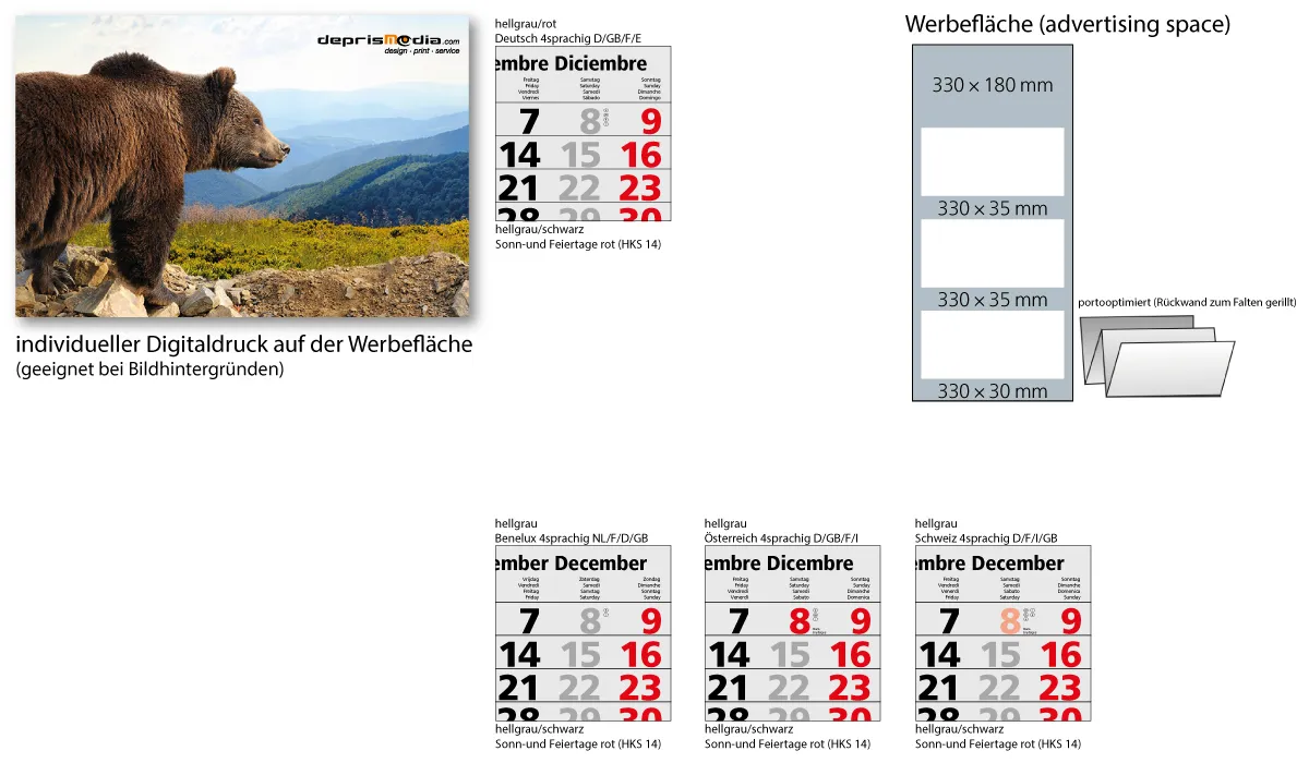 | Order no later than 06/19/2026 (proof confirmation must be submitted by 06/25/2026). Delivery on your desired date, if you specify it in your order, but not later than 09/01/2026. Orders without preferred date we do not deliver directly after completion, but before 07/01/2026. | product-no.: | GE560002 | delivery time: | 2-3 Wochen | weight: | 0,205 kg | format: | without trim: 330 x 700 mm total · with trim: 320 x 700 mm total · 300 x 140 mm per calendar block | calendar: | 4 languages D/GB/F/E light gray/red · Benelux 4 languages NL/F/D/GB light gray · Austria 4 languages D/GB/F/I light gray · Switzerland 4 languages D/F/I/GB light gray | Advertising: |