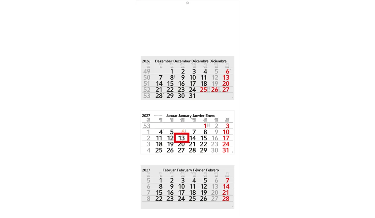 | Order no later than 06/19/2026 (proof confirmation must be submitted by 06/25/2026). Delivery on your desired date, if you specify it in your order, but not later than 09/01/2026. Orders without preferred date we do not deliver directly after completion, but before 07/01/2026. | product-no.: | GE520001 | delivery time: | 2-5 weeks | weight: | 0,200 kg | format: | without trim: 330 x 700 mm total · with trim: 320 x 700 mm total · 300 x 140 mm per calendar block | calendar: | 4 languages D/GB/F/E light gray | Advertising: |