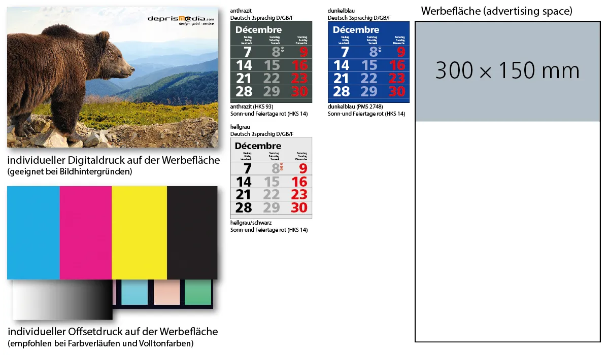 | Order no later than 06/19/2026 (proof confirmation must be submitted by 06/25/2026). Delivery on your desired date, if you specify it in your order, but not later than 09/01/2026. Orders without preferred date we do not deliver directly after completion, but before 07/01/2026. | product-no.: | GE160001 | delivery time: | 2-5 weeks | weight: | 0,155 kg | format: | 300 x 490 mm total · 300 x 350 mm calendar | calendar: | 3 languages ​​D/GB/F anthracite, dark blue or light gray | Advertising: |
