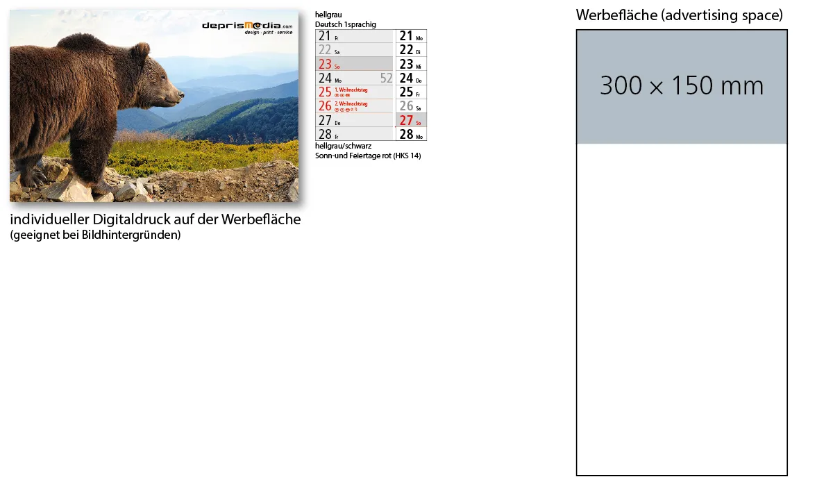 For calendars (with the exception of picture calendars), deprismedia.com sends samples from past productions. For this reason, calendars from the current or past years are made available to you. However, the versions and variants are always the same as the range for the coming year and are only used to order a main quantity. Alternative patterns are sometimes used for notebooks (in some cases a sample card is also supplied). These articles do not exactly match the notebook you ordered, but they do offer an equivalent product example. |