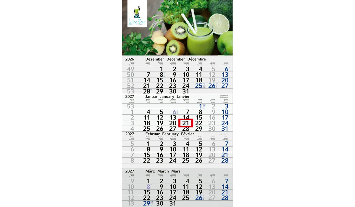 | Order no later than 06/19/2026 (proof confirmation must be submitted by 06/25/2026). Delivery on your desired date, if you specify it in your order, but not later than 09/01/2026. Orders without preferred date we do not deliver directly after completion, but before 07/01/2026. | product-no.: | GE140023 | delivery time: | 2-3 Wochen | weight: | 0,185 kg | format: | 300 x 560 mm total · 300 x 420 mm calendar | calendar: | 3 languages ​​D/GB/F light gray/red | Advertising: |