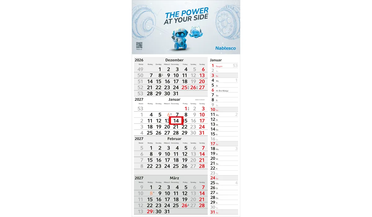 | Order no later than 06/19/2026 (proof confirmation must be submitted by 06/25/2026). Delivery on your desired date, if you specify it in your order, but not later than 09/01/2026. Orders without preferred date we do not deliver directly after completion, but before 07/01/2026. | product-no.: | GE340001 | delivery time: | 2-5 weeks | weight: | 0,215 kg | format: | 300 x 600 mm total · 300 x 460 mm calendar | calendar: | german 1 language light gray | Advertising: |
