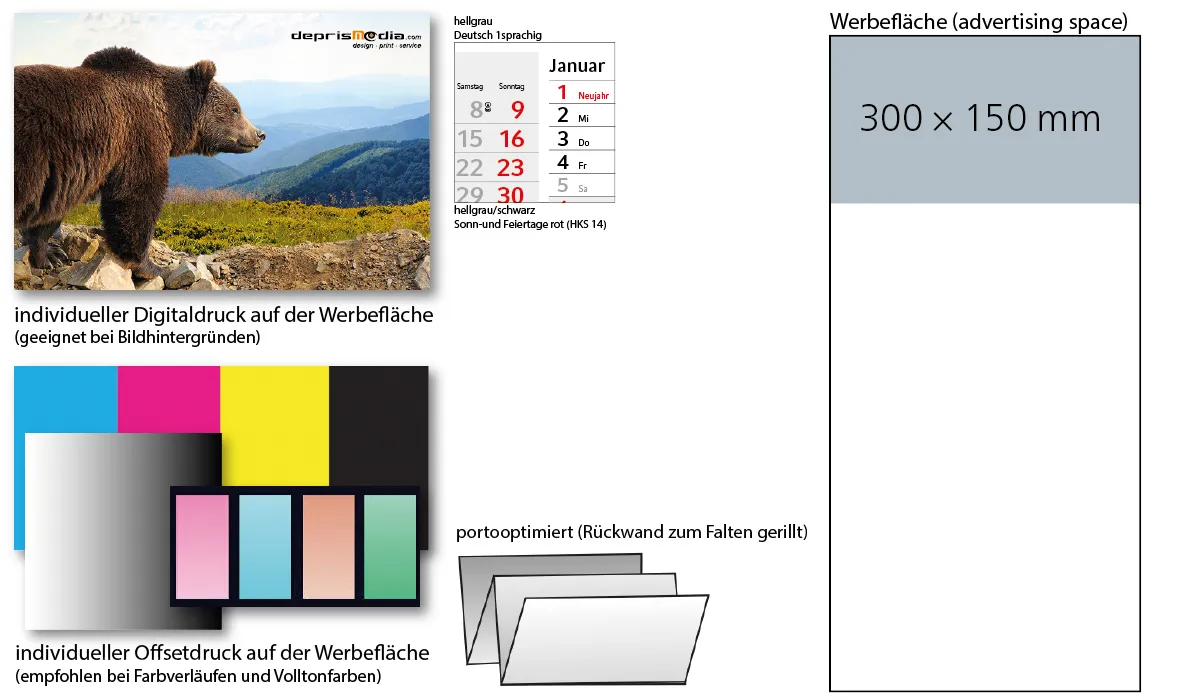 equipment: | perforated calendar pages · optimized for postage · back wall grooved for folding · red date slider (HKS 14) | option(s): | date slider in special colors (from 1.000 pieces) · eyelets | individual packaging: | corrugated packaging white: no. 17 - 313 x 350 x 19 mm (B4-large letter format) | packaging units: | 100 | advertising area: | 300 x 150 mm | print: | digital printing or offset printing on the top tab | printing ink: | cmyk | min. quantity: | 50 | country of origin: | ![]() |