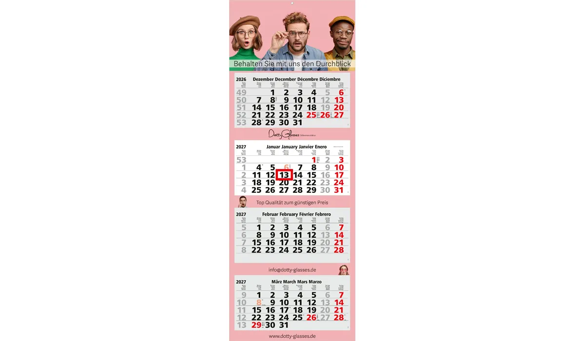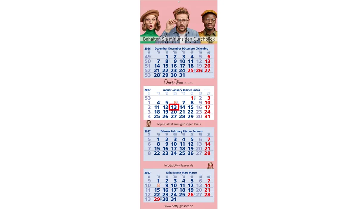 | Order no later than 06/19/2026 (proof confirmation must be submitted by 06/25/2026). Delivery on your desired date, if you specify it in your order, but not later than 09/01/2026. Orders without preferred date we do not deliver directly after completion, but before 07/01/2026. | product-no.: | GE740001 | delivery time: | 2-5 weeks | weight: | 0,345 kg | format: | 365 x 985 mm total · 335 x 160 mm per calendar block | calendar: | 4 languages D/GB/F/E light gray or light blue | Advertising: |