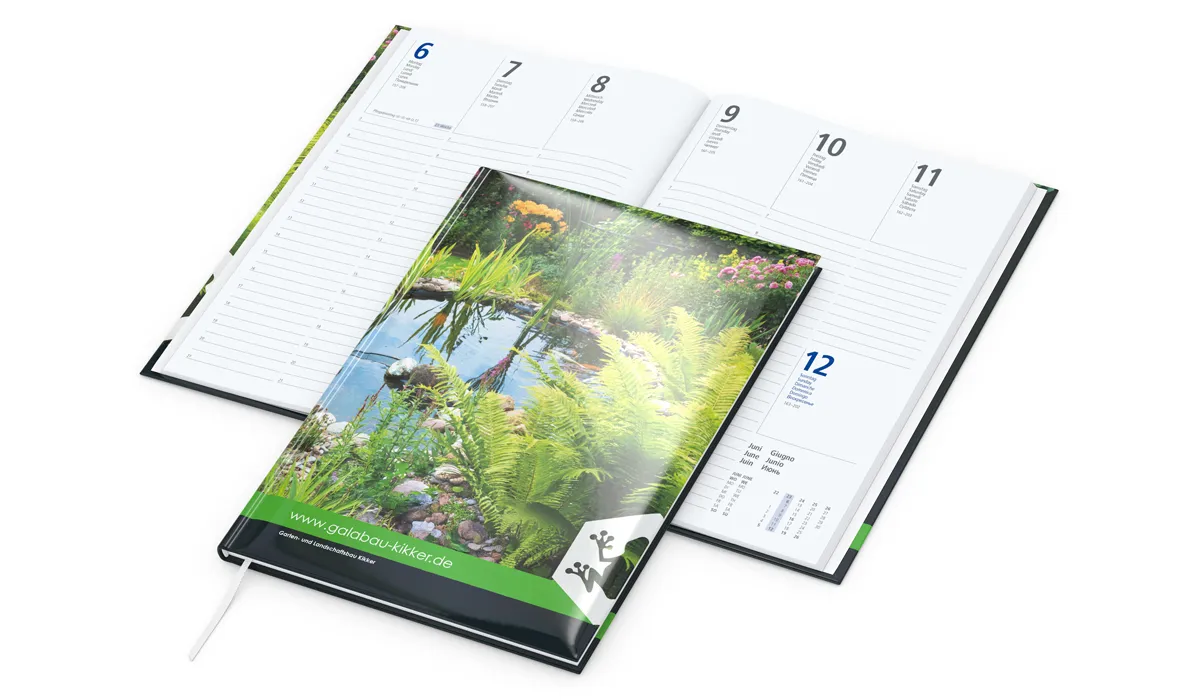 | Order no later than 06/19/2026 (proof confirmation must be submitted by 06/25/2026). Delivery on your desired date, if you specify it in your order, but not later than 09/01/2026. Orders without preferred date we do not deliver directly after completion, but before 07/01/2026. | product-no.: | GE1260000 | delivery time: | 2-5 weeks | format: | 175 x 245 mm total · 170 x 240 mm calendar block | calendar: | german 6 languages D/GB/F/I/E/RUS · each week 2 pages · hour division from 7 am to 9 pm · information part | range: | 128 pages | finishing: | hardcover with padded book cover · bookmark · headband · round back | option(s): | advertising pages · bookmark and headband in special colors · organization aids · single shrink-wrap | advertising area: | see downloads | min. quantity: | 25 | country of origin: | ![]() |
