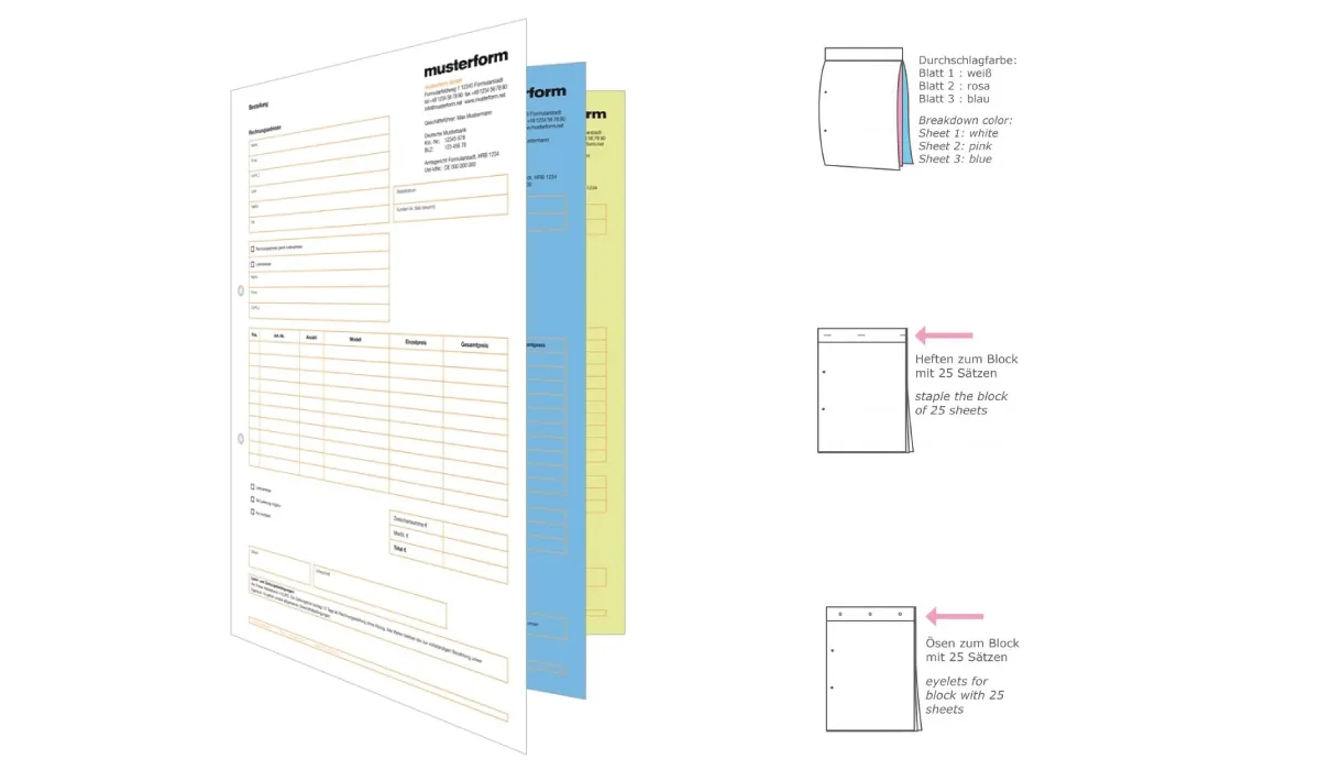 | product-no.: | GPP22301 | delivery time: | 2-3 Wochen | weight: | 3,000 kg | format: | 297 x 210 mm | variant(s): | 15 mm bar or gluing (on the header or footer) | equipment: | Filing holes on all sheets, back side printing in grey (HKS 92)! On request: Sheets with varying print image from side to side, numbering, carrier tape set, neutralization. | material: | double: first sheet (70 g/m² white - optional 80 g/m² white) - final sheet (55 g/m²), triple: - in addition with a middle sheet (53 g/m²), 4x: - in addition with two middle sheets (53 g/m²), 5x: - in addition with three middle sheets (53 g /m²) | option(s): | eyelets or stitching to block 25 sets | print: | offset printing | printing ink: | black · HKS · Pantone · cmyk | manufacturer: | deprismedia.com [Susann & Lars Ströse GbR] BahnhofstraĂŸe 32 DE-07422 Bad Blankenburg info@deprismedia.com www.deprismedia.com Tel. +49 3 67 41-1 88 36-0 |