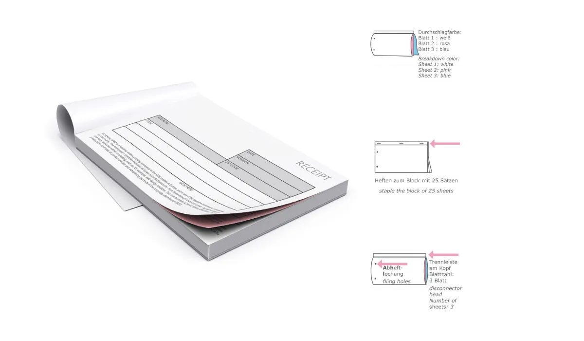 | product-no.: | GPP22303 | delivery time: | 2-3 Wochen | weight: | 2,000 kg | format: | 105 x 210 mm | variant(s): | 15 mm bar or gluing (on the header or footer) | equipment: | Filing holes on all sheets, back side printing in grey (HKS 92)! On request: Sheets with varying print image from side to side, numbering, carrier tape set, neutralization. | material: | double: first sheet (70 g/m² white - optional 80 g/m² white) - final sheet (55 g/m²), triple: - in addition with a middle sheet (53 g/m²), 4x: - in addition with two middle sheets (53 g/m²), 5x: - in addition with three middle sheets (53 g /m²) | option(s): | eyelets or stitching to block 25 sets | print: | offset printing | printing ink: | black · HKS · Pantone · cmyk | manufacturer: | deprismedia.com [Susann & Lars Ströse GbR] BahnhofstraĂŸe 32 DE-07422 Bad Blankenburg info@deprismedia.com www.deprismedia.com Tel. +49 3 67 41-1 88 36-0 |