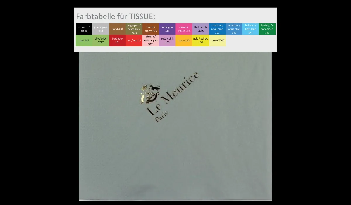 | product-no.: | Servietten aus Tissuewatte mit HeiĂŸfolienprägung | delivery time: | 4-6 weeks | colours: | white · champagne · yellow · curry · pink · antique rose · red · bordeaux · olive · kiwi · dark green · light blue · aqua blue · royal blue · purple · violet · aubergine · brown · beige-grey · sand · grey · black | min. quantity: | 5 | country of origin: | ![]() |