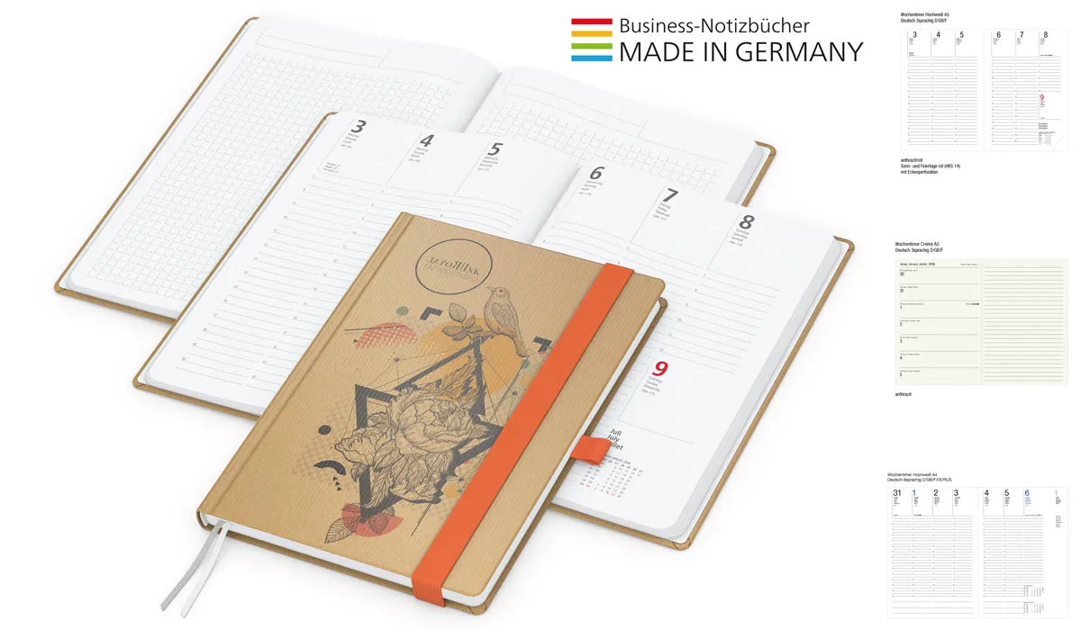 For calendars (with the exception of picture calendars), deprismedia.com sends samples from past productions. For this reason, calendars from the current or past years are made available to you. However, the versions and variants are always the same as the range for the coming year and are only used to order a main quantity. Alternative patterns are sometimes used for notebooks (in some cases a sample card is also supplied). These articles do not exactly match the notebook you ordered, but they do offer an equivalent product example. |