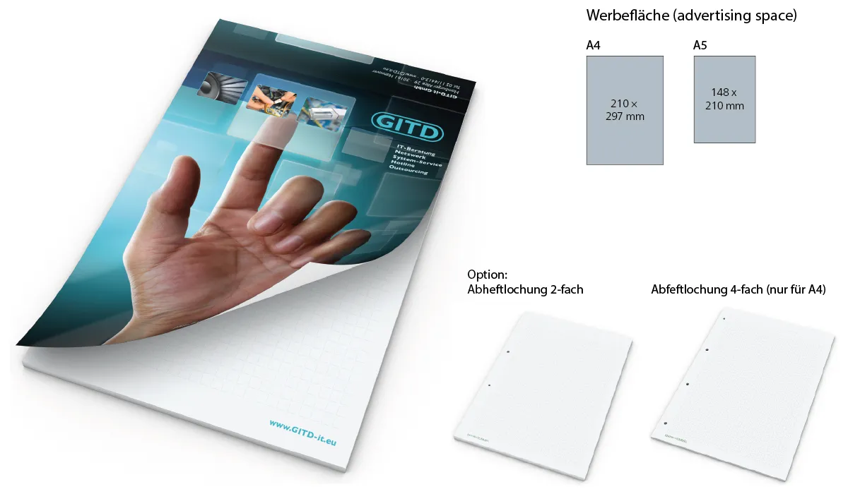 | product-no.: | Schreibblock Cover Bestseller A4 | delivery time: | 2-3 Wochen | min. quantity: | 50 | country of origin: | ![]() |