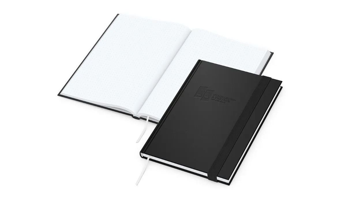 | product-no.: | GE25005 | delivery time: | 4-6 Wochen | weight: | 0,420 kg | format: | sheet format: 148 x 210 mm (A5) | colours: | dark blue · grey · light grey · navy blue · black | material of cover: | The 100% viscose surface impresses with its luxurious feel and silky matte sheen. It lends every product a luxurious appearance and elevates your brand to a premium level. The harmonious color palette in classic, elegant tones underscores style and quality. | range: | 192 pages plus insert pocket | finishing: | hardcover with non-padded book cover · book block and ceiling with pointed corners · bookmarks · headband · round back | equipment: | note pages with angled grid or dotted pattern · micro-perforation · insert pocket · 15 mm elastic band and pen loop in defined color combinations: dark blue cover with dark blue elastic band, gray cover with dark gray elastic band, light gray cover with silver gray elastic band, navy blue cover with medium blue elastic band, and black cover with black elastic band | material: | high white writing paper 90 g/m² | individual packaging: | corrugated shipping bag white: no. 23 - 285 x 200 mm | packaging units: | 40 | advertising area: | see downloads | print: | embossing inclusive | printing ink: | embossing: gold, copper, black-shiny or silver | min. quantity: | 50 | country of origin: | ![]() |