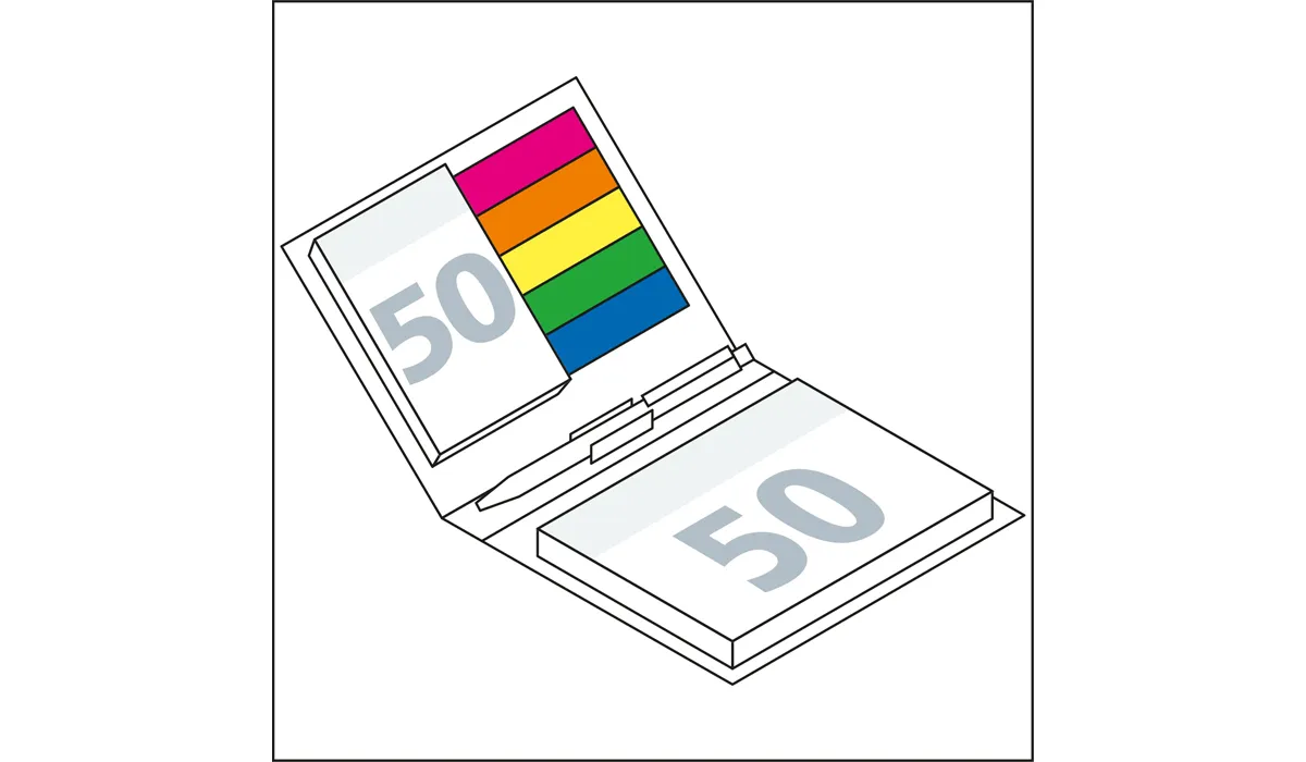 | product-no.: | GE8210110BI | delivery time: | 2-3 Wochen | weight: | 0,101 kg | format: | 105 x 90 mm closed | material of cover: | Bookcover: The bookbinding cover and its foil-laminated surface offer a lot of space for the design of the combi-sets. · Softcover: In high-gloss refined carton cover. | equipment: | sticky note 100 x 72 mm, 50 sheets of white adhesive paper · sticky note 50 x 72 mm, 50 sheets of white adhesive paper · film marker set (5 x 20 film markers 12 x 44 mm made of transparent, colored film) · mini ballpoint pen metal | material: | cover: bookcover gloss-individual | option(s): | cover bookcover matt-individual or natura brown or brown individual · paper marker set (5 x 20 paper markers 12 x 42 mm made of colored paper (at no extra charge) · change of print motif (on request) · single welding in | packaging units: | 96 | advertising area: | see downloads | print: | 4C-quality on sticky note and cover (one-sided) included | printing ink: | cmyk | min. quantity: | 250 | country of origin: | ![]() |