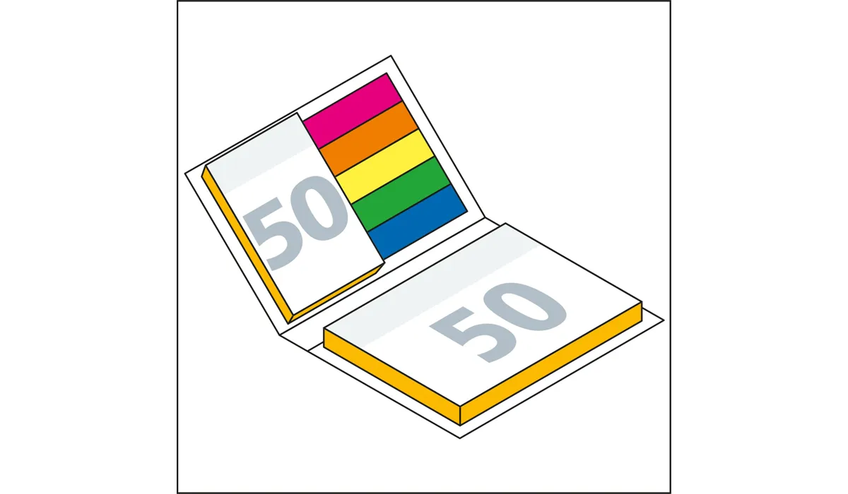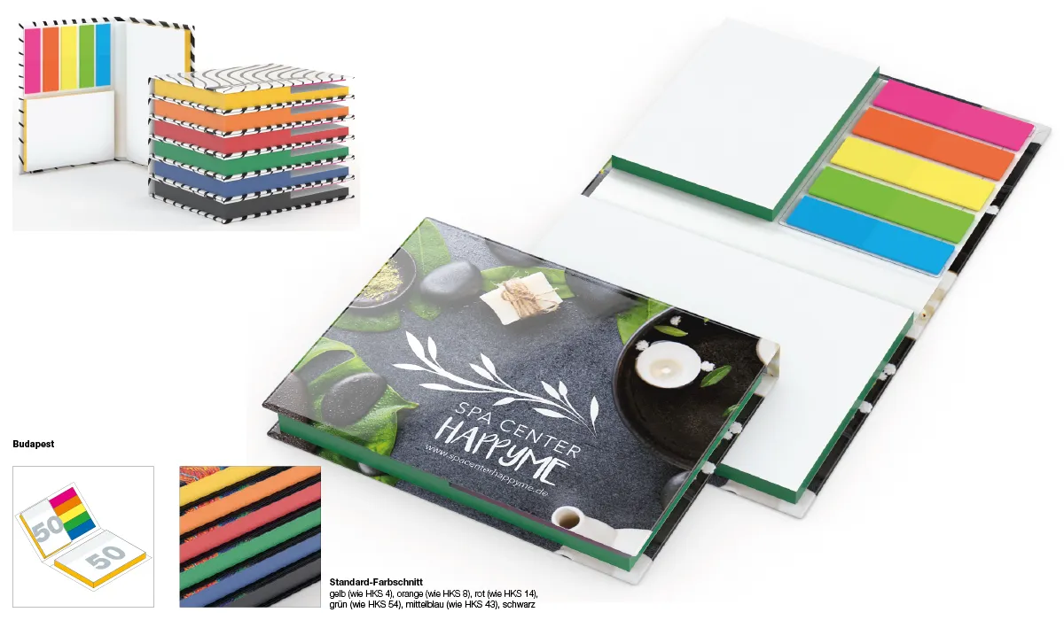 | product-no.: | GE949574C | delivery time: | 2-3 Wochen | weight: | 0,077 kg | format: | 105 x 78 mm closed · 105 x 169 mm open | material of cover: | Bookcover: The bookbinding cover and its foil-laminated surface offer a lot of space for the design of the combi-sets. · Natura: Modern, durable book cover material on pure pulp base: smooth, matte, natural. | equipment: | sticky note 100 x 72 mm, 50 sheets of adhesive paper white · sticky note 50 x 72 mm, 50 sheets of adhesive paper white · film marker set (5 x 20 film marker 12 x 45 mm made of transparent colored film) · standard color cut: edges of both sticky notes in yellow, orange, green, medium blue, red or black | material: | cover: bookcover or natura | option(s): | cover bookcover matt-individual or natura brown or brown individual · paper marker set (5 x 20 paper markers 12 x 42 mm made of colored paper (at no extra charge) · change of print motif (on request) · single welding in | packaging units: | 144 | advertising area: | see downloads | print: | 4C-quality on the cover included · sticky notes white blank | printing ink: | cmyk | min. quantity: | 100 | country of origin: | ![]() |