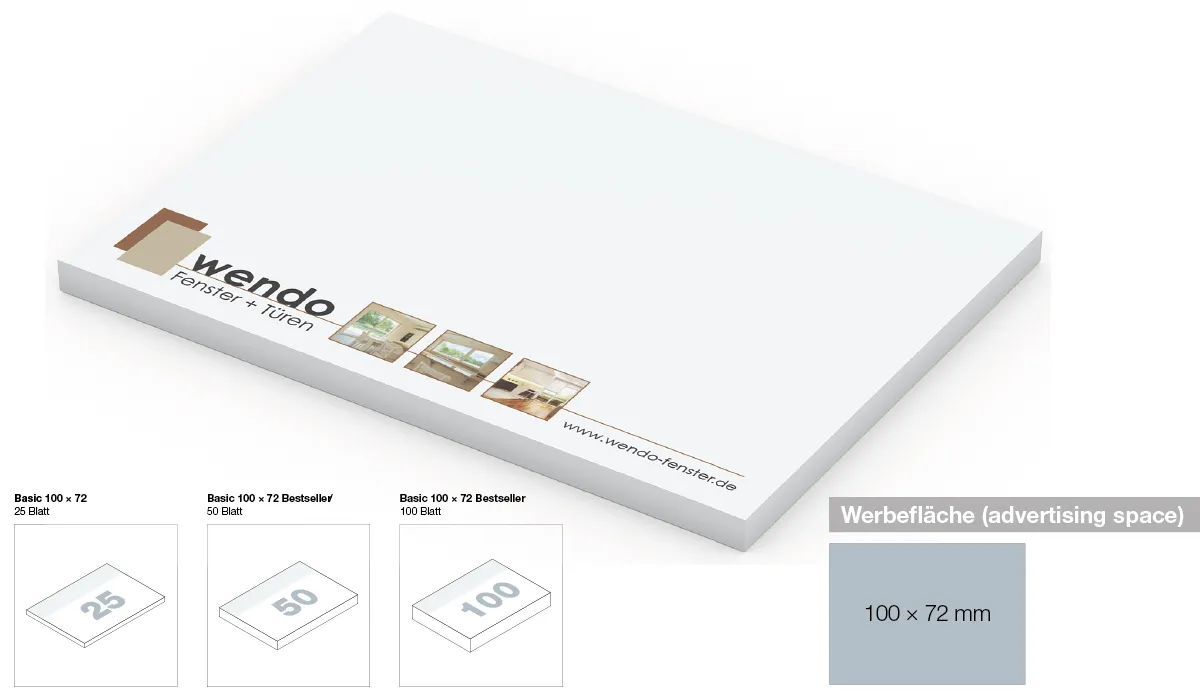 | Art.Nr.: | Haftnotizen Basic 100 x 72 mm Bestseller | Lieferzeit: | 2-3 Wochen | Mindestmenge: | 100 | Herkunftsland: | ![]() |