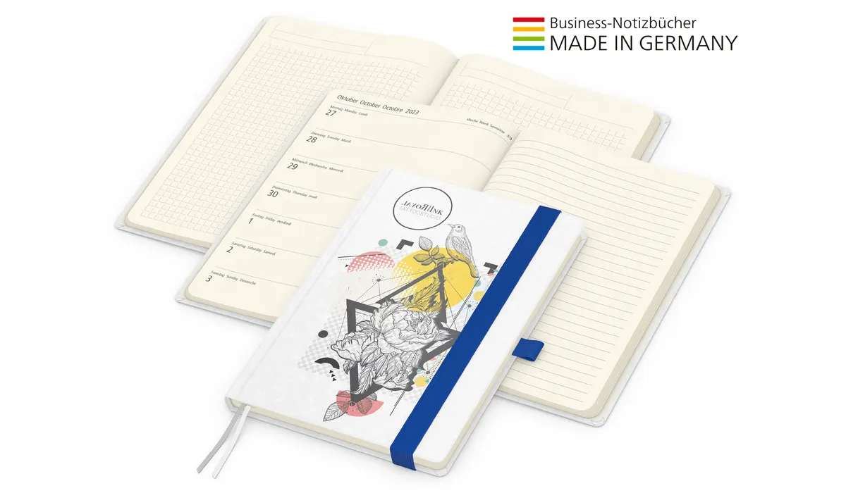 | Art.Nr.: | GE22003 | Lieferzeit: | 4-6 weeks | Gewicht: | 0,420 kg | Format: | Blattformate: 148 x 210 mm (A5) | Farbe: | gloss-individuell | Einbandmaterial (Umschlag): | Karton mit veredelter Oberfläche: Gloss: der hochglänzende Klassiker | Kalendarium: | Deutsch 3sprachig D/GB/F je Woche 1 Seite: links Wochenübersicht, rechts linierte Notizseite | Umfang: | 192 Seiten plus Einstecktasche · Wochenkalendarium Creme · 160 Seiten Kalendarium (August 2026 - Dezember 2027), links Wochenübersicht, rechts linierte Notizseite · 32 zusätzliche Notizseiten am Ende | Verarbeitung: | Hardcover mit unwattierter Buchdecke · Buchblock und Decke mit runden Ecken · 2 Lesezeichen · Kapitalband · runder Rücken | Ausstattung: | Notizseiten mit Winkelkaro und Mikroperforation · Notizseiten im Kalendariumsteil liniert · Einstecktasche · Gummiband 15 mm und Stiftschlaufe gelb, grün, mittelblau, orange, rot, schwarz oder silbergrau | Material: | Schreibpapier 90 g/m² | Einzelverpackung: | Wellpapp-Versandtasche weiß: Nr. 23 - 285 x 200 mm | Verpackungseinheit: | 40 | Werbefläche: | siehe Standbogen | Druck: | 4C-Quality Digital inklusive | Druckfarben: | 4C-Euroskala | Mindestmenge: | 25 | Herkunftsland: | ![]() |