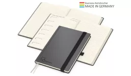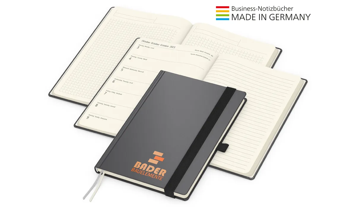 | Art.Nr.: | 14404 | Lieferzeit: | 3-4 Wochen | Gewicht: | 0,420 kg | Format: | Blattformate: 148 x 210 mm (A5) | Farbe: | anthrazit | Einbandmaterial (Umschlag): | Karton mit veredelter Oberfläche: Matt und modern als strapazierfähiger und preiswerter Bezugsstoff für alle Hardcover-Einbände. | Kalendarium: | Deutsch 3sprachig D/GB/F je Woche 1 Seite: links Wochenübersicht, rechts linierte Notizseite | Umfang: | 192 Seiten plus Einstecktasche · Wochenkalendarium Creme · 160 Seiten Kalendarium (August 2026 - Dezember 2027), links Wochenübersicht, rechts linierte Notizseite · 32 zusätzliche Notizseiten am Ende | Verarbeitung: | Hardcover mit unwattierter Buchdecke · Buchblock und Decke mit runden Ecken · 2 Lesezeichen · Kapitalband · runder Rücken | Ausstattung: | Notizseiten mit Winkelkaro und Mikroperforation · Notizseiten im Kalendariumsteil liniert · Einstecktasche · Gummiband 15 mm und Stiftschlaufe schwarz | Material: | Schreibpapier 90 g/m² | Einzelverpackung: | Wellpapp-Versandtasche weiß: Nr. 23 - 285 x 200 mm | Verpackungseinheit: | 40 | Werbefläche: | siehe Standbogen | Druck: | Siebdruck-Digital inklusive | Druckfarben: | 4C-Euroskala | Mindestmenge: | 10 | Herkunftsland: | ![]() |
