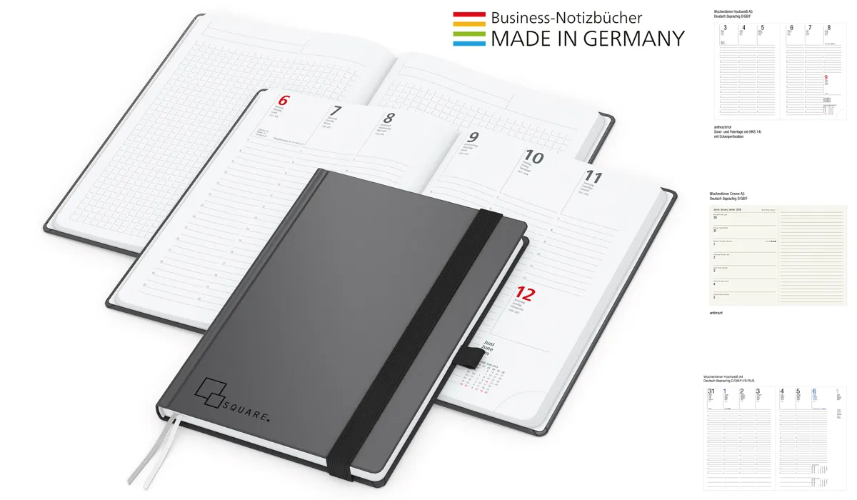 | Art.Nr.: | GE14402 | Lieferzeit: | 3-4 Wochen | Gewicht: | 0,420 kg | Format: | Blattformate: 148 x 210 mm (A5) | Farbe: | anthrazit | Einbandmaterial (Umschlag): | Karton mit veredelter Oberfläche: Matt und modern als strapazierfähiger und preiswerter Bezugsstoff für alle Hardcover-Einbände. | Kalendarium: | Deutsch 3sprachig D/GB/F je Woche 2 Seiten | Umfang: | 192 Seiten plus Einstecktasche · Wochenkalendarium Hochweiß · 128 Seiten Kalendarium + 64 Seiten Notizen | Verarbeitung: | Hardcover mit unwattierter Buchdecke · Buchblock und Decke mit runden Ecken · Eckenperforation · 2 Lesezeichen · Kapitalband · runder Rücken | Ausstattung: | Notizseiten mit Winkelkaro und Mikroperforation · Einstecktasche · Gummiband 15 mm und Stiftschlaufe schwarz | Material: | Schreibpapier 90 g/m² | Einzelverpackung: | Wellpapp-Versandtasche weiß: Nr. 23 - 285 x 200 mm | Verpackungseinheit: | 40 | Werbefläche: | siehe Standbogen | Druck: | Prägung inklusive | Druckfarben: | Prägung: gold, kupfer, schwarz-glänzend oder silber | Mindestmenge: | 25 | Herkunftsland: | ![]() |