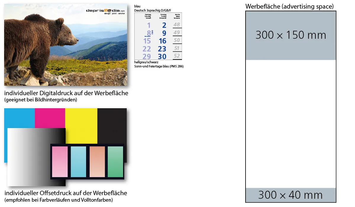 | Bestellung bis spätestens 19.06.2026 (Druckfreigabe muss bis spätestens 25.06.2026 vorliegen). Lieferung zu Ihrem Wunschtermin, wenn Sie diesen in Ihrer Bestellung angeben, spätestens jedoch zum 01.09.2026. Bestellungen ohne Wunschtermin liefern wir direkt nach Fertigstellung, jedoch nicht vor dem 01.07.2026. | Art.Nr.: | GE280002 | Lieferzeit: | 2-5 Wochen | Gewicht: | 0,170 kg | Format: | 300 x 600 mm gesamt · 300 x 420 mm Kalendarium | Kalendarium: | Deutsch 3sprachig D/GB/F blau | Werbeeindruck: |
