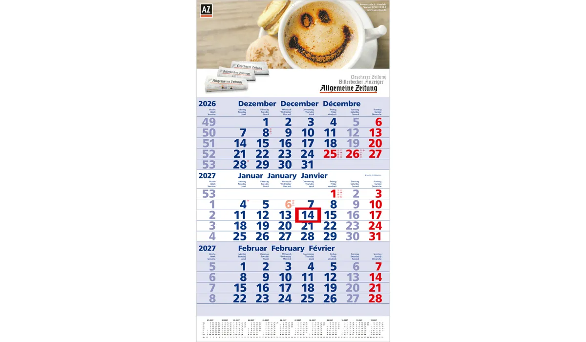 | Bestellung bis spätestens 19.06.2026 (Druckfreigabe muss bis spätestens 25.06.2026 vorliegen). Lieferung zu Ihrem Wunschtermin, wenn Sie diesen in Ihrer Bestellung angeben, spätestens jedoch zum 01.09.2026. Bestellungen ohne Wunschtermin liefern wir direkt nach Fertigstellung, jedoch nicht vor dem 01.07.2026. | Art.Nr.: | GE180001 | Lieferzeit: | 2-5 Wochen | Gewicht: | 0,165 kg | Format: | 300 x 530 mm gesamt · 300 x 350 mm Kalendarium | Kalendarium: | Deutsch 3sprachig D/GB/F hellgrau oder hellblau | Werbeeindruck: |