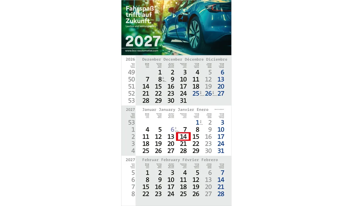 | Bestellung bis spätestens 19.06.2026 (Druckfreigabe muss bis spätestens 25.06.2026 vorliegen). Lieferung zu Ihrem Wunschtermin, wenn Sie diesen in Ihrer Bestellung angeben, spätestens jedoch zum 01.09.2026. Bestellungen ohne Wunschtermin liefern wir direkt nach Fertigstellung, jedoch nicht vor dem 01.07.2026. | Art.Nr.: | GE300001 | Lieferzeit: | 2-5 Wochen | Gewicht: | 0,200 kg | Format: | 300 x 560 mm gesamt · 300 x 420 mm Kalendarium | Kalendarium: | Deutsch 4sprachig D/GB/F/E rot oder blau | Werbeeindruck: |