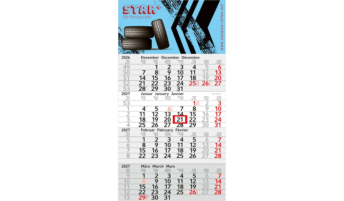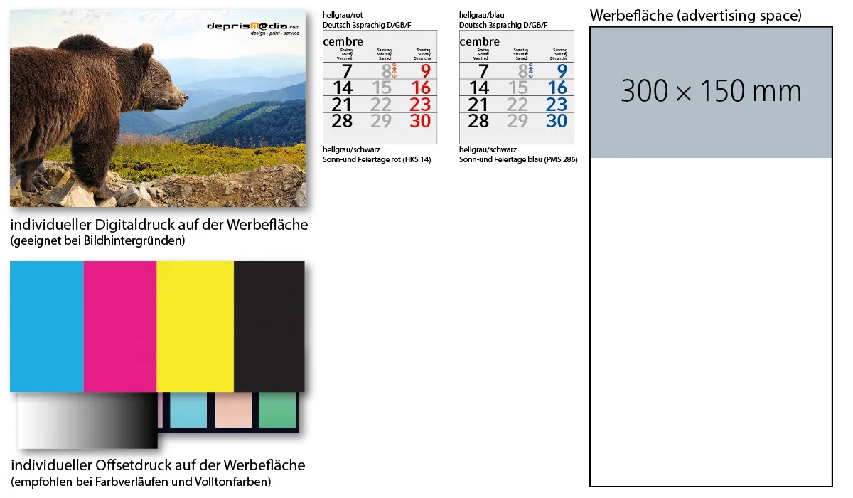 | Bestellung bis spätestens 19.06.2026 (Druckfreigabe muss bis spätestens 25.06.2026 vorliegen). Lieferung zu Ihrem Wunschtermin, wenn Sie diesen in Ihrer Bestellung angeben, spätestens jedoch zum 01.09.2026. Bestellungen ohne Wunschtermin liefern wir direkt nach Fertigstellung, jedoch nicht vor dem 01.07.2026. | Art.Nr.: | GE140021 | Lieferzeit: | 2-5 weeks | Gewicht: | 0,185 kg | Format: | 300 x 560 mm gesamt · 300 x 420 mm Kalendarium | Kalendarium: | Deutsch 3sprachig D/GB/F hellgrau/rot oder hellgrau/blau | Werbeeindruck: |