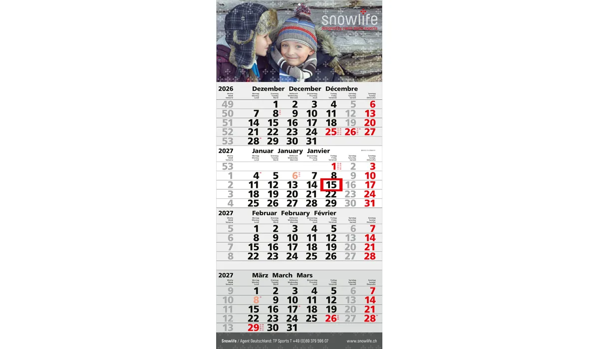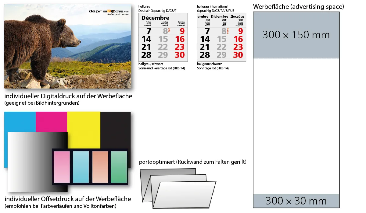 | Bestellung bis spätestens 19.06.2026 (Druckfreigabe muss bis spätestens 25.06.2026 vorliegen). Lieferung zu Ihrem Wunschtermin, wenn Sie diesen in Ihrer Bestellung angeben, spätestens jedoch zum 01.09.2026. Bestellungen ohne Wunschtermin liefern wir direkt nach Fertigstellung, jedoch nicht vor dem 01.07.2026. | Art.Nr.: | GE200014 | Lieferzeit: | 2-5 Wochen | Gewicht: | 0,185 kg | Format: | 300 x 630 mm gesamt · 300 x 460 mm Kalendarium | Kalendarium: | Deutsch 3sprachig D/GB/F hellgrau oder International 6sprachig D/GB/F/E/I/RUS hellgrau | Werbeeindruck: |