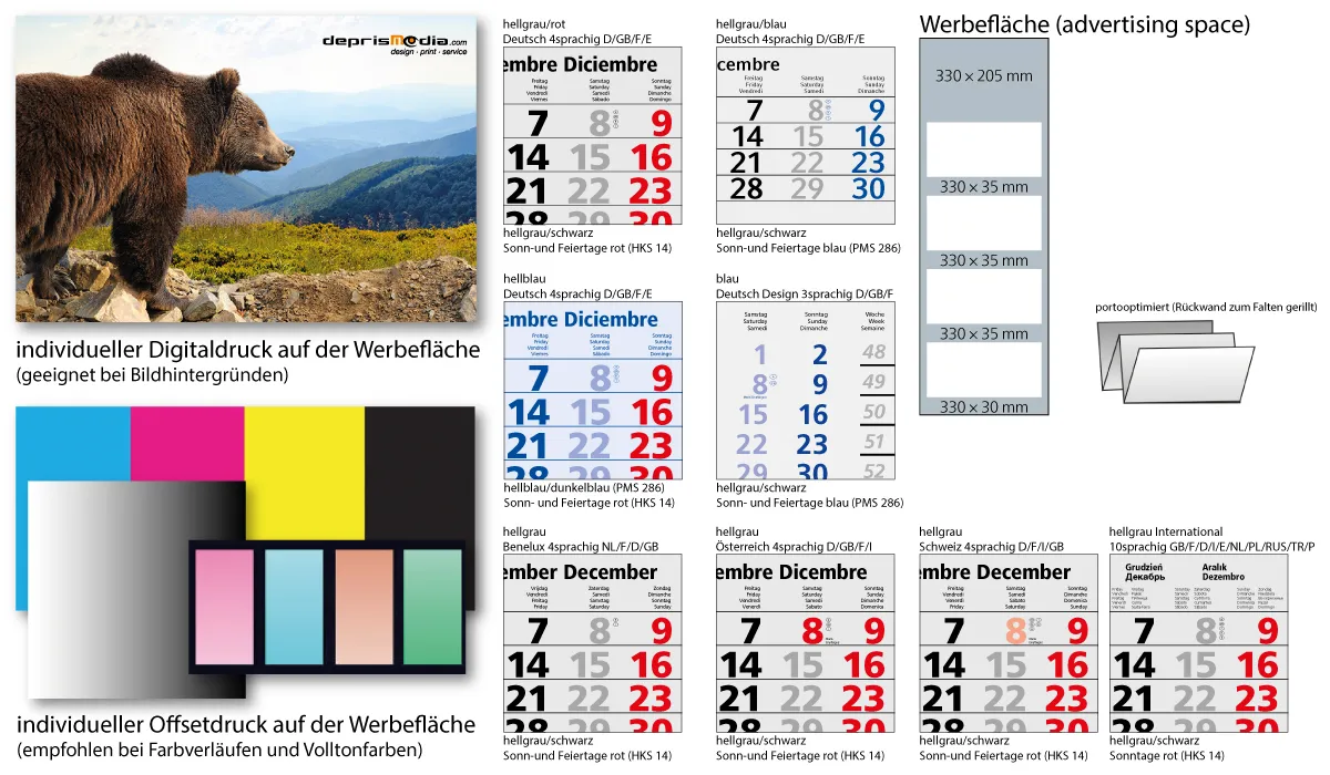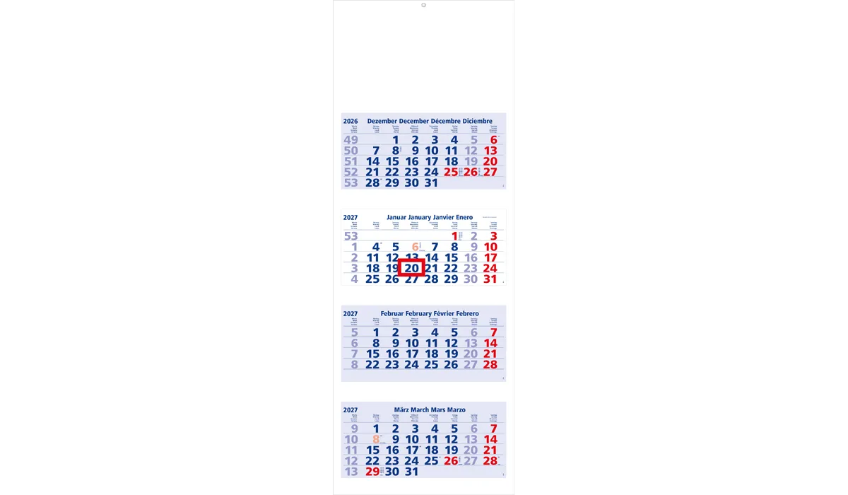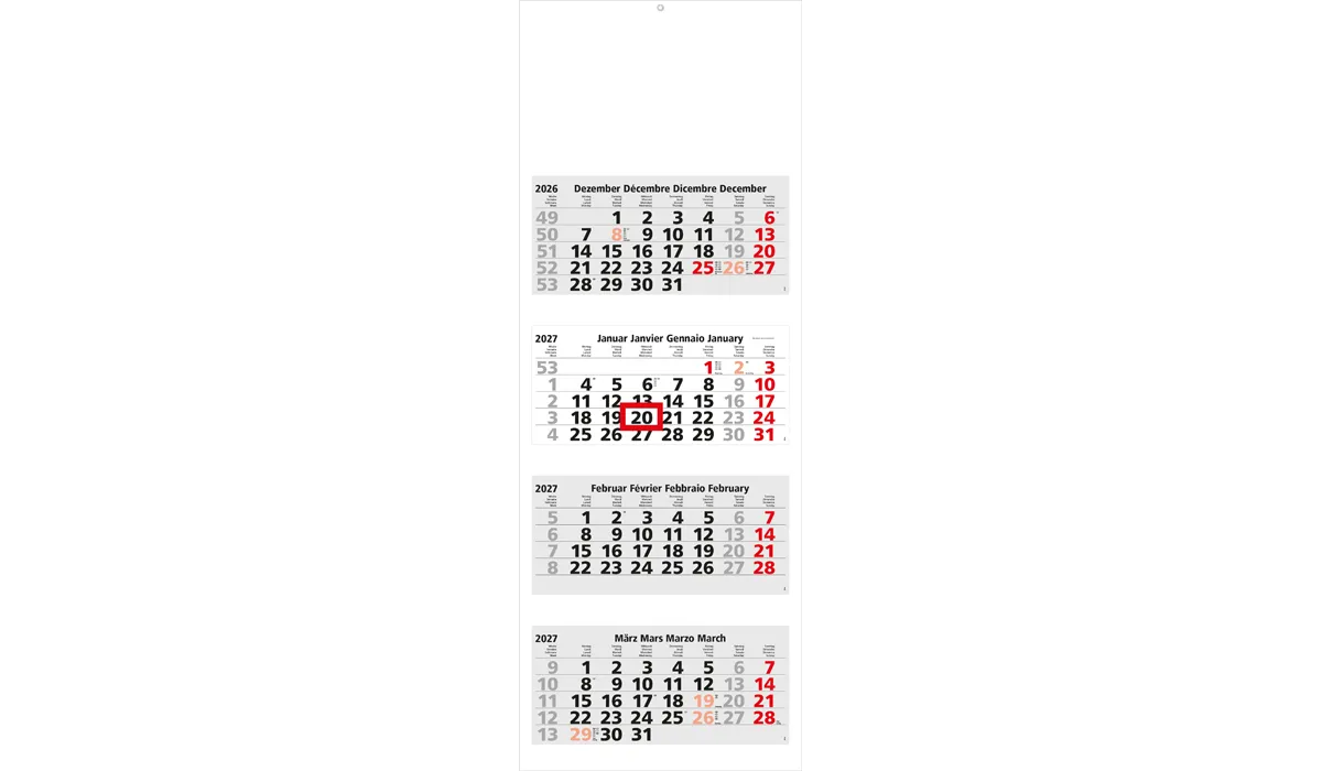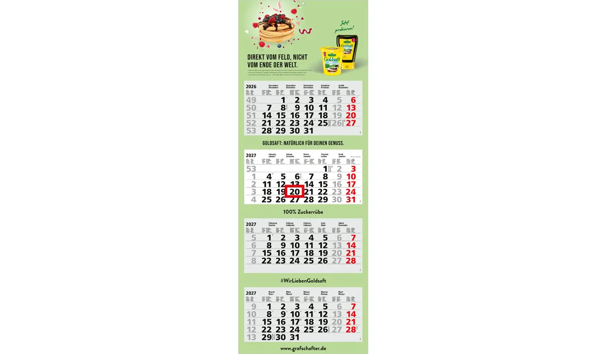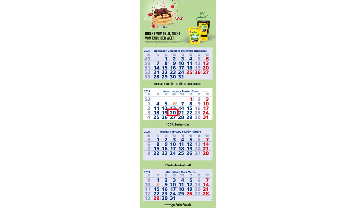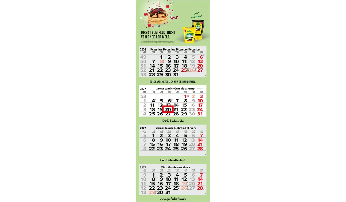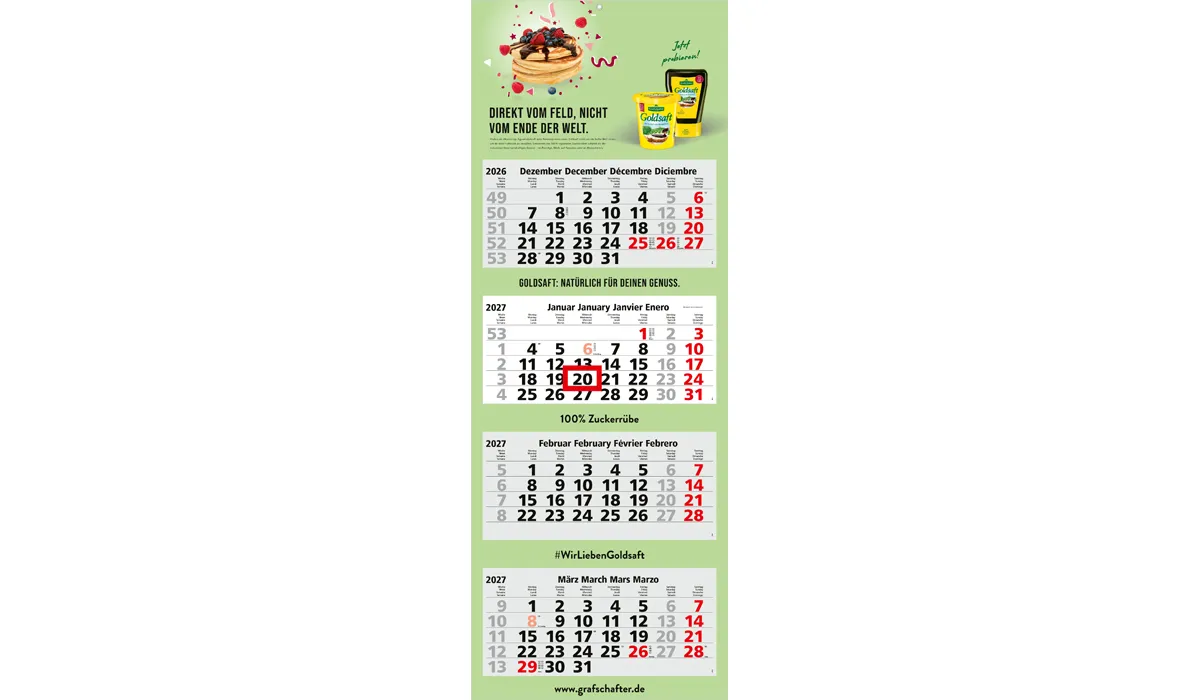 | Bestellung bis spätestens 19.06.2026 (Druckfreigabe muss bis spätestens 25.06.2026 vorliegen). Lieferung zu Ihrem Wunschtermin, wenn Sie diesen in Ihrer Bestellung angeben, spätestens jedoch zum 01.09.2026. Bestellungen ohne Wunschtermin liefern wir direkt nach Fertigstellung, jedoch nicht vor dem 01.07.2026. | Art.Nr.: | GE580001 | Lieferzeit: | 2-5 Wochen | Gewicht: | 0,265 kg | Format: | ohne Randanschnitt: 330 x 900 mm gesamt · mit Randanschnitt: 320 x 900 mm gesamt · 300 x 140 mm je Kalenderblock | Kalendarium: | Deutsch 4sprachig D/GB/F/E hellgrau/rot, hellgrau/blau oder hellblau · Deutsch Design 3sprachig D/GB/F blau oder International 10sprachig GB/F/D/I/E/NL/PL/RUS/TR/P hellgrau · Benelux 4sprachig NL/F/D/GB hellgrau · Österreich 4sprachig D/GB/F/I hellgrau · Schweiz 4sprachig D/F/I/GB hellgrau | Werbeeindruck: |