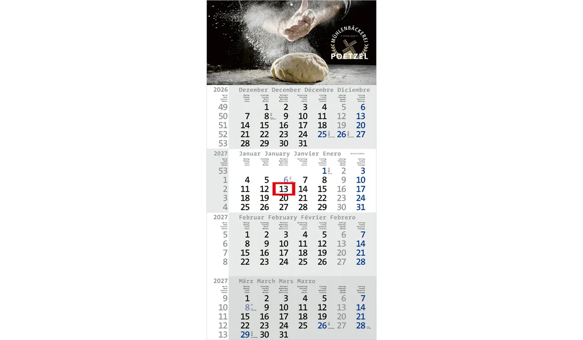| Bestellung bis spätestens 19.06.2026 (Druckfreigabe muss bis spätestens 25.06.2026 vorliegen). Lieferung zu Ihrem Wunschtermin, wenn Sie diesen in Ihrer Bestellung angeben, spätestens jedoch zum 01.09.2026. Bestellungen ohne Wunschtermin liefern wir direkt nach Fertigstellung, jedoch nicht vor dem 01.07.2026. | Art.Nr.: | GE300011 | Lieferzeit: | 2-5 Wochen | Gewicht: | 0,215 kg | Format: | 300 x 600 mm gesamt · 300 x 460 mm Kalendarium | Kalendarium: | Deutsch 4sprachig D/GB/F/E rot oder blau | Werbeeindruck: |