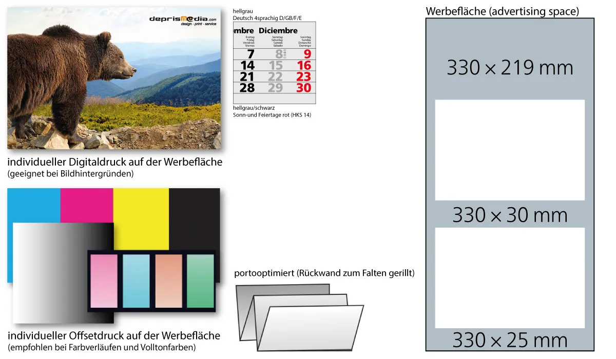 | Bestellung bis spätestens 19.06.2026 (Druckfreigabe muss bis spätestens 25.06.2026 vorliegen). Lieferung zu Ihrem Wunschtermin, wenn Sie diesen in Ihrer Bestellung angeben, spätestens jedoch zum 01.09.2026. Bestellungen ohne Wunschtermin liefern wir direkt nach Fertigstellung, jedoch nicht vor dem 01.07.2026. | Art.Nr.: | GE640001 | Lieferzeit: | 2-5 weeks | Gewicht: | 0,210 kg | Format: | ohne Randanschnitt: 330 x 700 mm gesamt · mit Randanschnitt: 320 x 700 mm gesamt · 300 x 213 mm je Kalenderblock | Kalendarium: | Deutsch 4sprachig D/GB/F/E hellgrau | Werbeeindruck: |