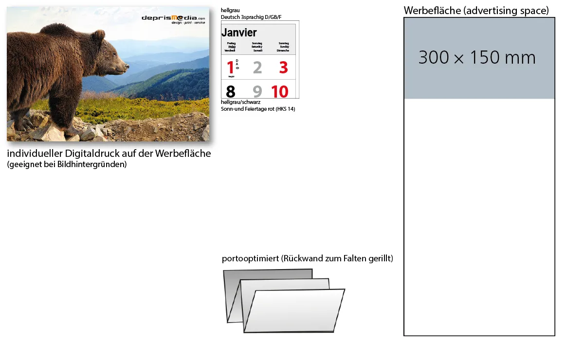 Ausstattung: | Kalenderblätter perforiert · portooptimiert zu versenden · Rückwand zum Falten gerillt · Datumsschieber rot (HKS 14) | Einzelverpackung: | Wellpapp-Verpackung weiß: Nr. 17 - 313 x 350 x 19 mm (B4-Großbrief-Format) | Verpackungseinheit: | 100 | Werbefläche: | 300 x 150 mm | Druck: | Digitaldruck auf der Kopflasche (inklusive) | Druckfarben: | CMYK | Mindestmenge: | 25 | Herkunftsland: | ![]() |
