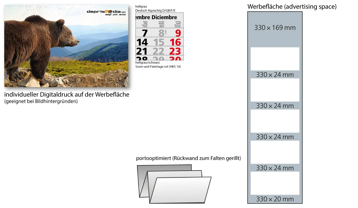 | Bestellung bis spätestens 19.06.2026 (Druckfreigabe muss bis spätestens 25.06.2026 vorliegen). Lieferung zu Ihrem Wunschtermin, wenn Sie diesen in Ihrer Bestellung angeben, spätestens jedoch zum 01.09.2026. Bestellungen ohne Wunschtermin liefern wir direkt nach Fertigstellung, jedoch nicht vor dem 01.07.2026. | Art.Nr.: | GE600002 | Lieferzeit: | 2-3 Wochen | Gewicht: | 0,315 kg | Format: | ohne Randanschnitt: 330 x 985 mm gesamt · mit Randanschnitt: 320 x 985 mm gesamt · 300 x 140 mm je Kalenderblock | Kalendarium: | Deutsch 4sprachig D/GB/F/E hellgrau | Werbeeindruck: |
