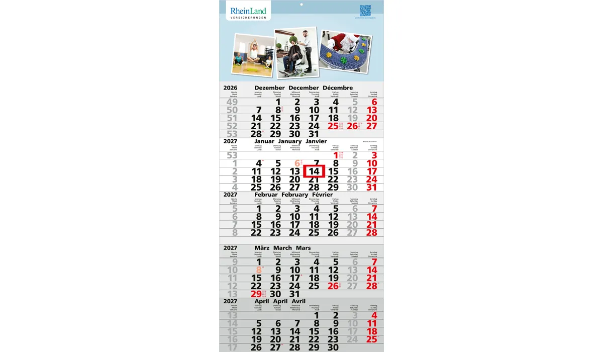 | Bestellung bis spätestens 19.06.2026 (Druckfreigabe muss bis spätestens 25.06.2026 vorliegen). Lieferung zu Ihrem Wunschtermin, wenn Sie diesen in Ihrer Bestellung angeben, spätestens jedoch zum 01.09.2026. Bestellungen ohne Wunschtermin liefern wir direkt nach Fertigstellung, jedoch nicht vor dem 01.07.2026. | Art.Nr.: | GE220001 | Lieferzeit: | 2-5 weeks | Gewicht: | 0,230 kg | Format: | 300 x 640 mm gesamt · 300 x 500 mm Kalendarium | Kalendarium: | Deutsch 3sprachig D/GB/F hellgrau | Werbeeindruck: |