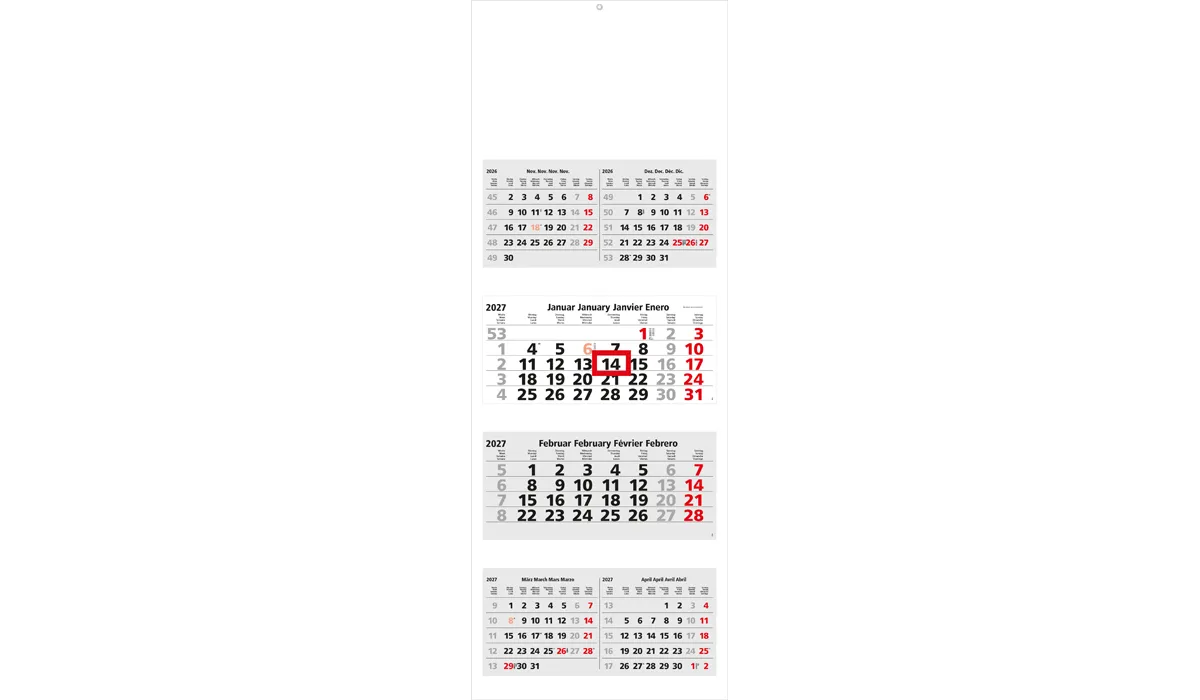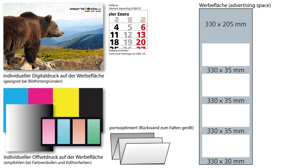 | Bestellung bis spätestens 19.06.2026 (Druckfreigabe muss bis spätestens 25.06.2026 vorliegen). Lieferung zu Ihrem Wunschtermin, wenn Sie diesen in Ihrer Bestellung angeben, spätestens jedoch zum 01.09.2026. Bestellungen ohne Wunschtermin liefern wir direkt nach Fertigstellung, jedoch nicht vor dem 01.07.2026. | Art.Nr.: | GE620002 | Lieferzeit: | 2-5 Wochen | Gewicht: | 0,270 kg | Format: | ohne Randanschnitt: 330 x 900 mm gesamt · mit Randanschnitt: 320 x 900 mm gesamt · 300 x 140 mm je Kalenderblock | Kalendarium: | Deutsch 4sprachig D/GB/F/E hellgrau | Werbeeindruck: |