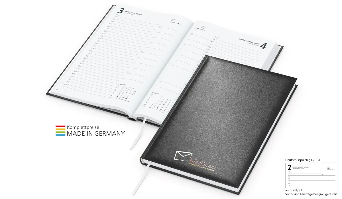 | Bestellung bis spätestens 19.06.2026 (Druckfreigabe muss bis spätestens 25.06.2026 vorliegen). Lieferung zu Ihrem Wunschtermin, wenn Sie diesen in Ihrer Bestellung angeben, spätestens jedoch zum 01.09.2026. Bestellungen ohne Wunschtermin liefern wir direkt nach Fertigstellung, jedoch nicht vor dem 01.07.2026. | Art.Nr.: | GE1120004 | Lieferzeit: | 2-3 Wochen | Gewicht: | 0,390 kg | Format: | 148 x 210 mm gesamt (DIN A5) · 142 x 205 mm Kalenderblock | Farben: | dunkelblau · schwarz | Einbandmaterial (Umschlag): | Das Kunstleder-Material auf Papierträger hat eine leichte lederähnliche Narbung, ist strapazierfähig und preiswert. | Kalendarium: | Deutsch 3sprachig D/GB/F · je Tag eine Seite · Samstag und Sonntag zusammengefaßt · Halbstunden-Einteilung von 7 bis 22 Uhr · Informationsteil | Umfang: | 320 Seiten | Verarbeitung: | Hardcover mit wattierter Buchdecke · Eckenperforation · Lesezeichen · Kapitalband · runder Rücken | Einzelverpackung: | Wellpapp-Versandtasche weiß: Nr. 23 - 285 x 200 mm | Verpackungseinheit: | 60 | Werbefläche: | siehe Standbogen | Druck: | Siebdruck-Digital inklusive | Druckfarben: | 4C-Euroskala | Mindestmenge: | 25 | Herkunftsland: | ![]() |