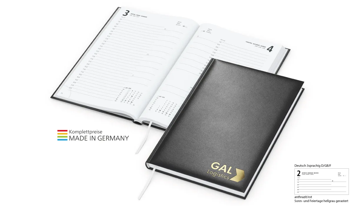 | Bestellung bis spätestens 19.06.2026 (Druckfreigabe muss bis spätestens 25.06.2026 vorliegen). Lieferung zu Ihrem Wunschtermin, wenn Sie diesen in Ihrer Bestellung angeben, spätestens jedoch zum 01.09.2026. Bestellungen ohne Wunschtermin liefern wir direkt nach Fertigstellung, jedoch nicht vor dem 01.07.2026. | Art.Nr.: | GE1120003 | Lieferzeit: | 2-3 Wochen | Gewicht: | 0,390 kg | Format: | 148 x 210 mm gesamt (DIN A5) · 142 x 205 mm Kalenderblock | Farben: | dunkelblau · schwarz | Einbandmaterial (Umschlag): | Das Kunstleder-Material auf Papierträger hat eine leichte lederähnliche Narbung, ist strapazierfähig und preiswert. | Kalendarium: | Deutsch 3sprachig D/GB/F · je Tag eine Seite · Samstag und Sonntag zusammengefaßt · Halbstunden-Einteilung von 7 bis 22 Uhr · Informationsteil | Umfang: | 320 Seiten | Verarbeitung: | Hardcover mit wattierter Buchdecke · Eckenperforation · Lesezeichen · Kapitalband · runder Rücken | Einzelverpackung: | Wellpapp-Versandtasche weiß: Nr. 23 - 285 x 200 mm | Verpackungseinheit: | 60 | Werbefläche: | siehe Standbogen | Druck: | Silberprägung inklusive (auf Wunsch auch Goldprägung oder Kupferprägung ohne Mehrpreis) | Druckfarben: | silber | Mindestmenge: | 50 | Herkunftsland: | ![]() |