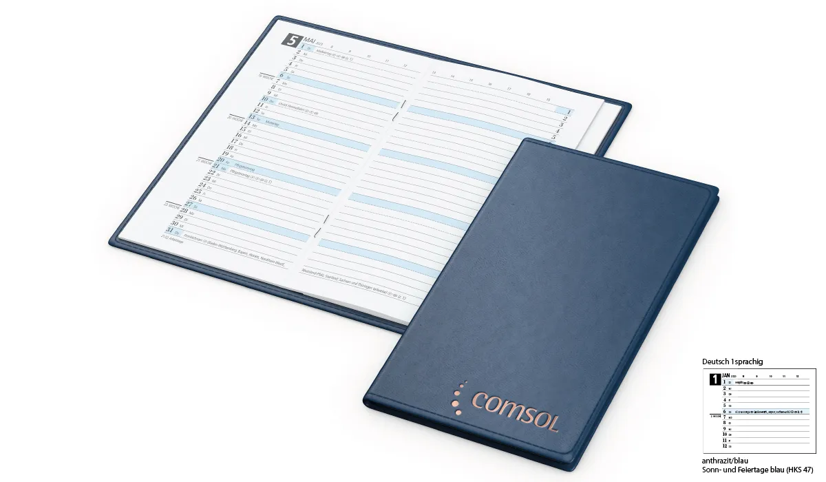 | Bestellung bis spätestens 19.06.2026 (Druckfreigabe muss bis spätestens 25.06.2026 vorliegen). Lieferung zu Ihrem Wunschtermin, wenn Sie diesen in Ihrer Bestellung angeben, spätestens jedoch zum 01.09.2026. Bestellungen ohne Wunschtermin liefern wir direkt nach Fertigstellung, jedoch nicht vor dem 01.07.2026. | Art.Nr.: | GE1400006 | Lieferzeit: | 2-5 Wochen | Gewicht: | 0,080 kg | Format: | 95 x 160 mm gesamt · 87 x 152 mm Kalendarium | Farben: | dunkelblau · grün · mittelblau · schwarzmeliert · tiefschwarz | Einbandmaterial (Umschlag): | Edles Kunstleder mit samtiger Oberfläche – weich und geschmeidig im Griff. Zertifizierung nach - STANDARD 100 by OEKO-Tex -. Attraktive Blindprägung durch den Thermoeffekt. | Kalendarium: | Deutsch 1sprachig · je Monat 2 Seiten · 24 Monate: Juli 2026 - Juni 2028 | Umfang: | 64 Seiten plus 16 Seiten Adressenheft | Verarbeitung: | Kalenderheft und Adressenheft mit Rückenheftung | Option(en): | Adressenheft mit Registerstanzung · Notizheft (32 Seiten, perforiert) · Werbeseiten · Druck auf Umschlag Adressenheft, Notizheft oder Kalendarium auf Anfrage | Verpackungseinheit: | 200 | Werbefläche: | siehe Standbogen | Druck: | 4C-Quality Digitaldruck oder Offsetdruck (D) · Heißfolienprägung (Einzelnamen) (E) · Heißfolienprägung (I) · Werbeseiten (W) | Druckfarben: | Digitaldruck oder Offsetdruck: 4C-Euroskala (D) · Prägung: gold, silber, schwarz-glänzend, blind (E) · Prägung: gold, silber, schwarz-glänzend, blind (I) · Werbeseiten: Digitaldruck oder Offsetdruck: 4C-Euroskala (W) | Mindestmenge: | 50 | Herkunftsland: | ![]() |