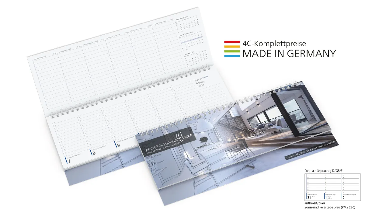 | Bestellung bis spätestens 19.06.2026 (Druckfreigabe muss bis spätestens 25.06.2026 vorliegen). Lieferung zu Ihrem Wunschtermin, wenn Sie diesen in Ihrer Bestellung angeben, spätestens jedoch zum 01.09.2026. Bestellungen ohne Wunschtermin liefern wir direkt nach Fertigstellung, jedoch nicht vor dem 01.07.2026. | Art.Nr.: | GE1000015 | Lieferzeit: | 2-3 weeks | Gewicht: | 0,170 kg | Format: | 304 x 135 mm gesamt · 304 x 105 mm Kalenderblocks | Farbe: | individuell | Einbandmaterial (Umschlag): | Hochwertiger Chromosulfatkarton aus natürlichen Rohstoffen, die selbstverständlich aus nachhaltiger Wald- und Forstwirtschaft stammen. | Kalendarium: | Deutsch 3sprachig D/GB/F · je Woche 2 Seiten · Stundeneinteilung von 8 bis 20 Uhr auf dem unteren Blatt · Notizraum und 3-Monats-Übersicht auf dem oberen Blatt · Informationsteil | Umfang: | 112 Seiten | Verarbeitung: | Wire-O-Bindung weiß | Einzelverpackung: | Wellpapp-Verpackung weiß: Nr. 09 - 320 x 148 x 18 mm | Verpackungseinheit: | 90 | Werbefläche: | siehe Standbogen | Druck: | 4C-Quality Digital inkl. (Ober- und Unterdeckel) | Druckfarben: | 4C-Euroskala | Mindestmenge: | 25 | Herkunftsland: | ![]() |